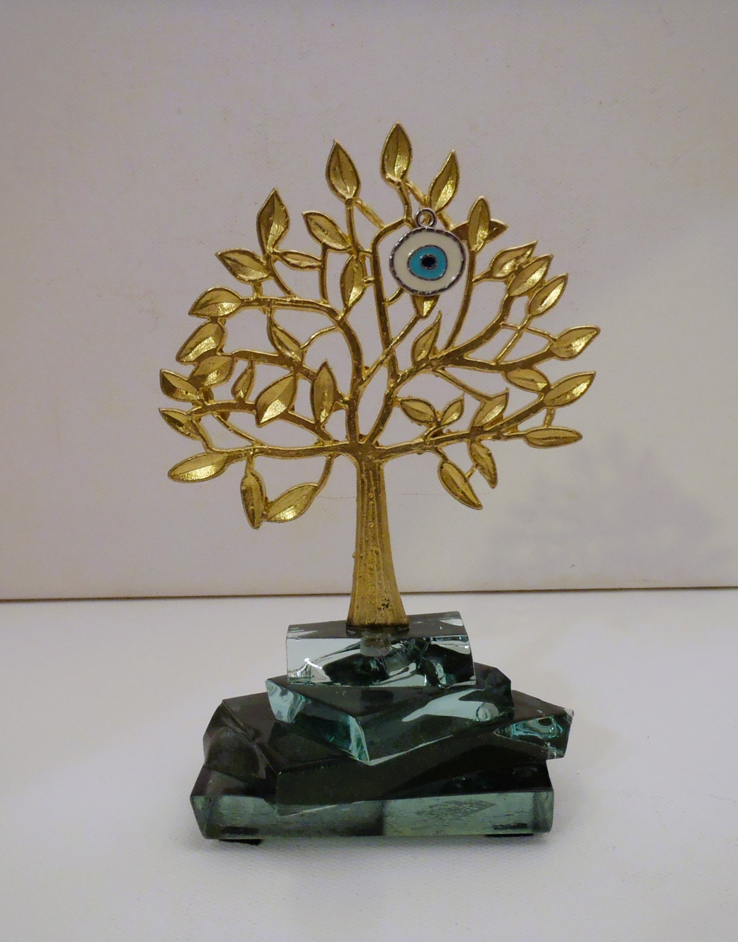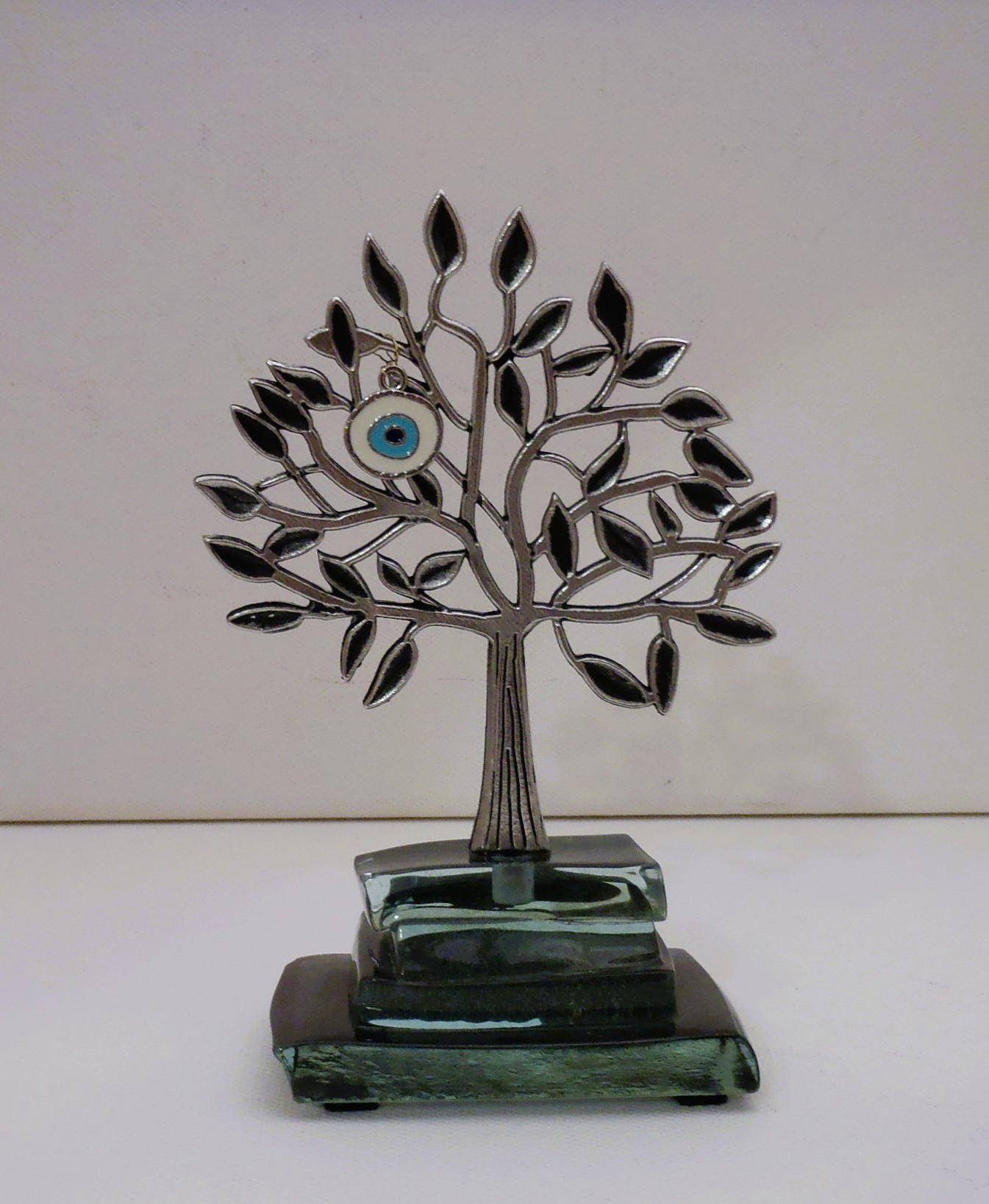 Χειροποίητο επιτραπέζιο διακοσμητικό γούρι δέντρο της ζωής σε δύο χρώματα χρυσό και ασημένιο τοποθετημένο σε βάση από φυσητό γυαλί και σε διάσταση 14χ9εκ.