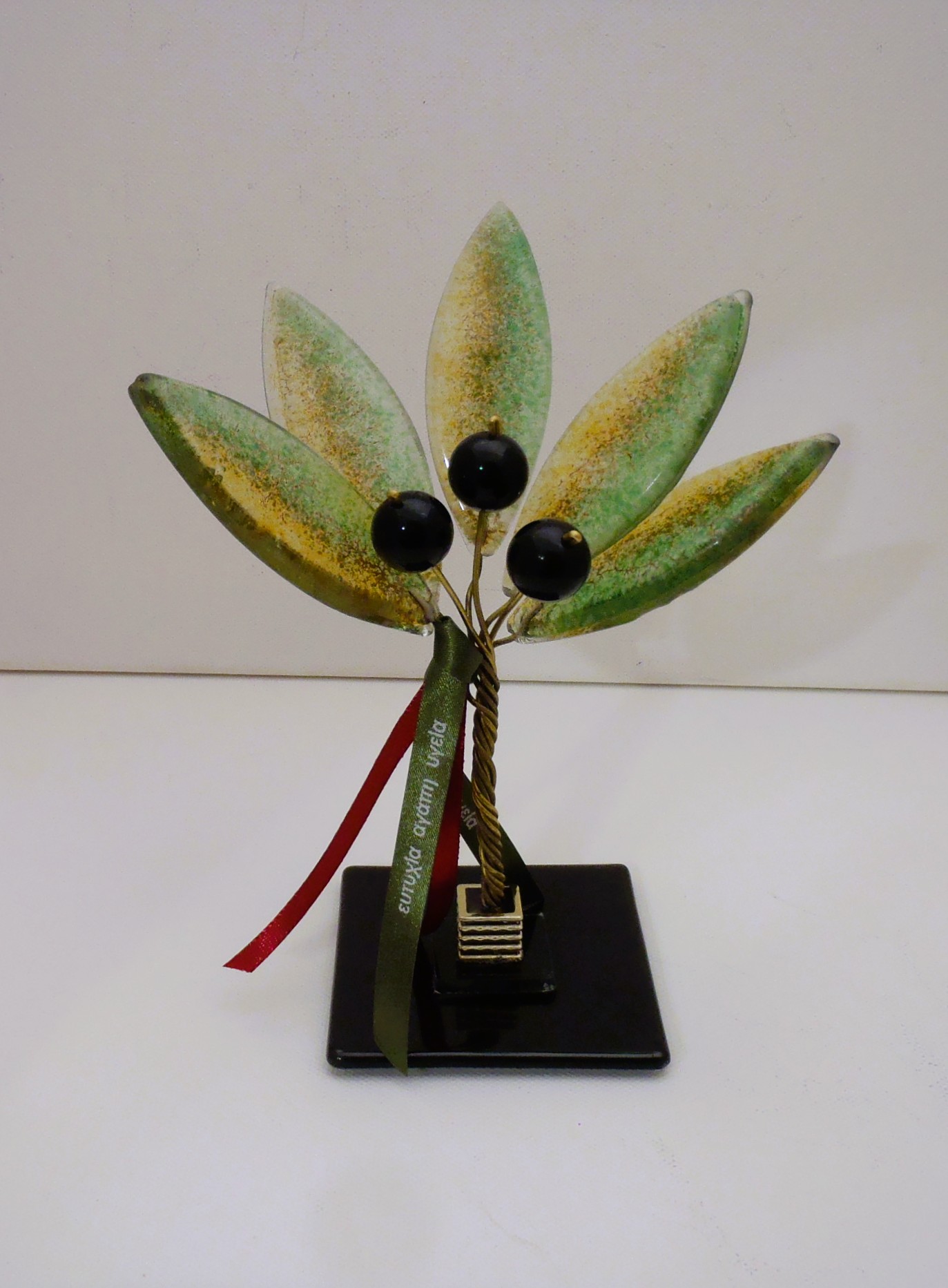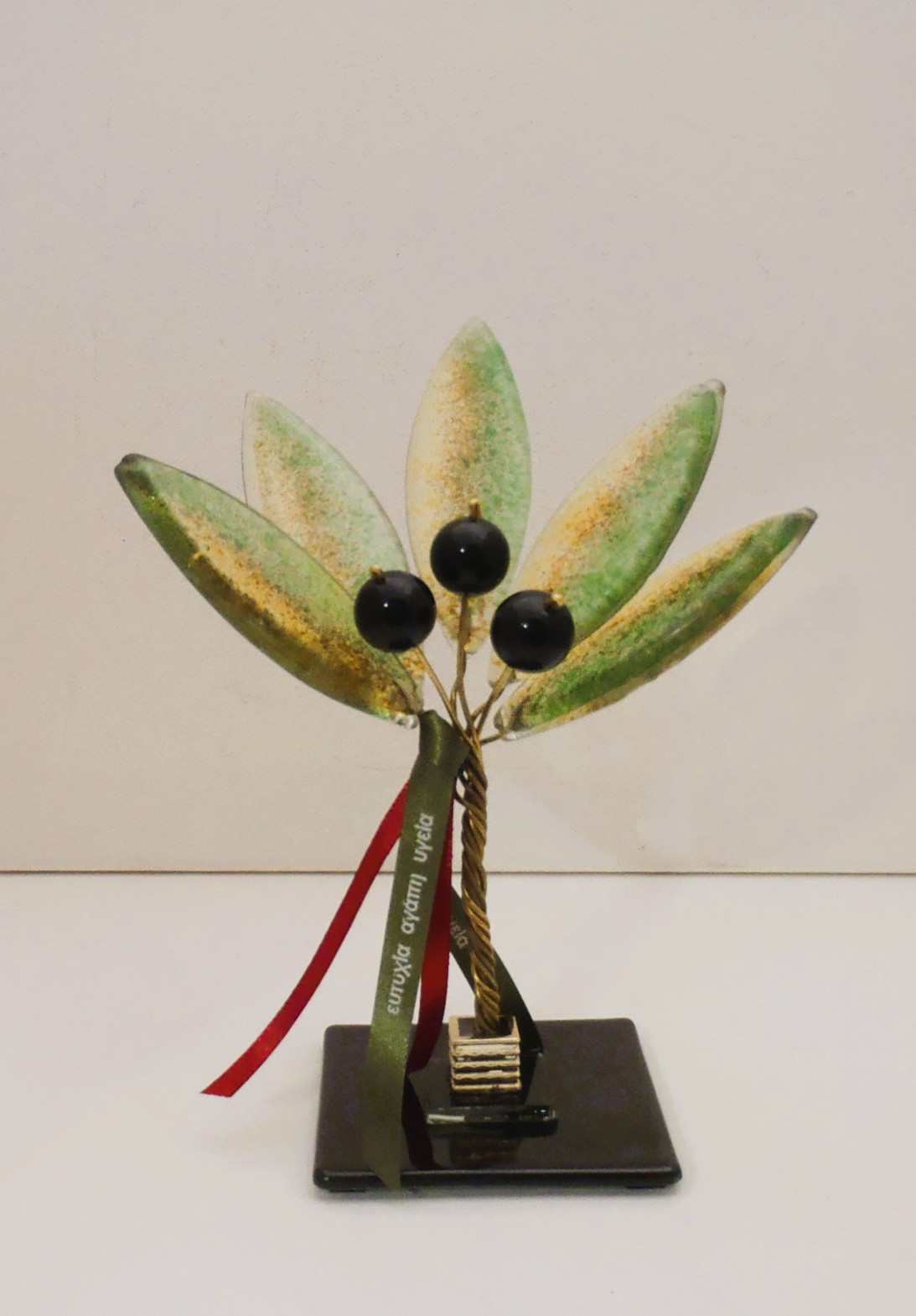 Χειροποίητο επιτραπέζιο γούρι δέντρο ελιάς από φυσητό γυαλί σε διάσταση 18χ16χ8εκ.