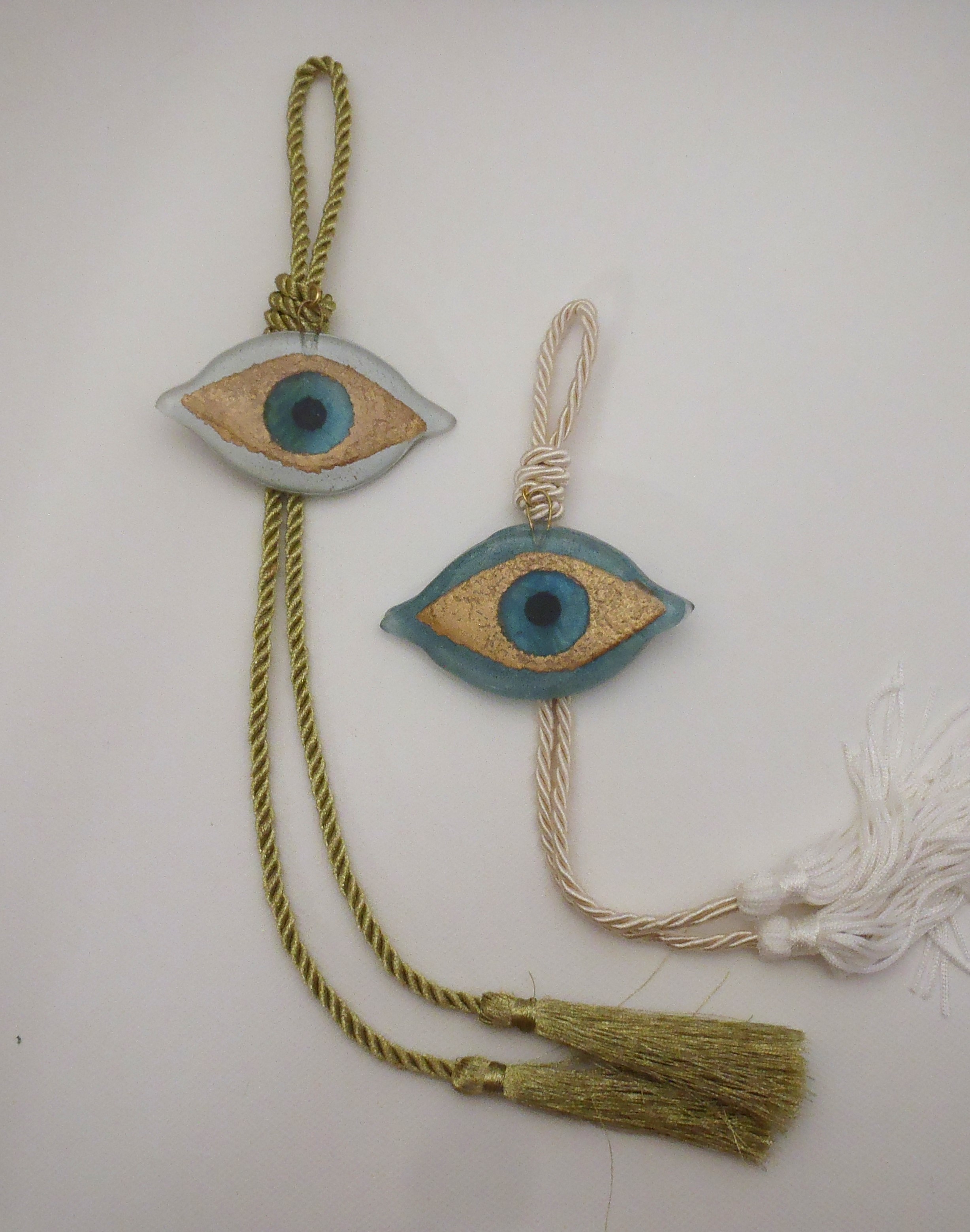 Χειροποίητο κρεμαστό γούρι με μάτι από φυσητό γυαλί σε δύο χρώματα λευκό και σιέλ και διάσταση 7χ3,5χ30εκ.