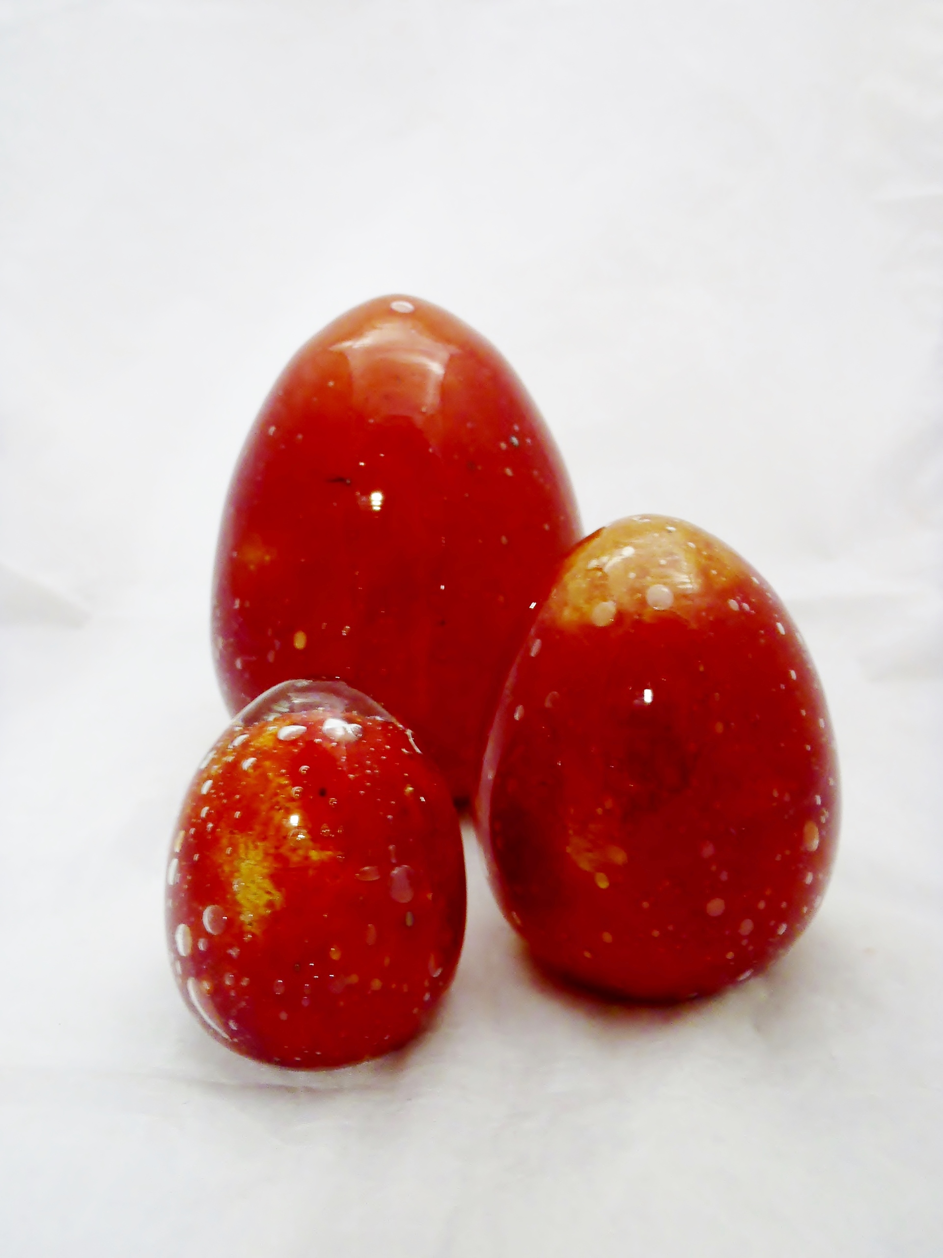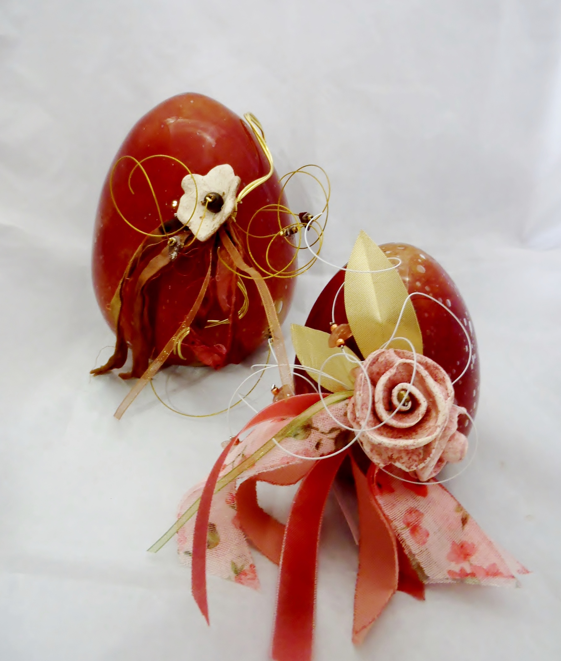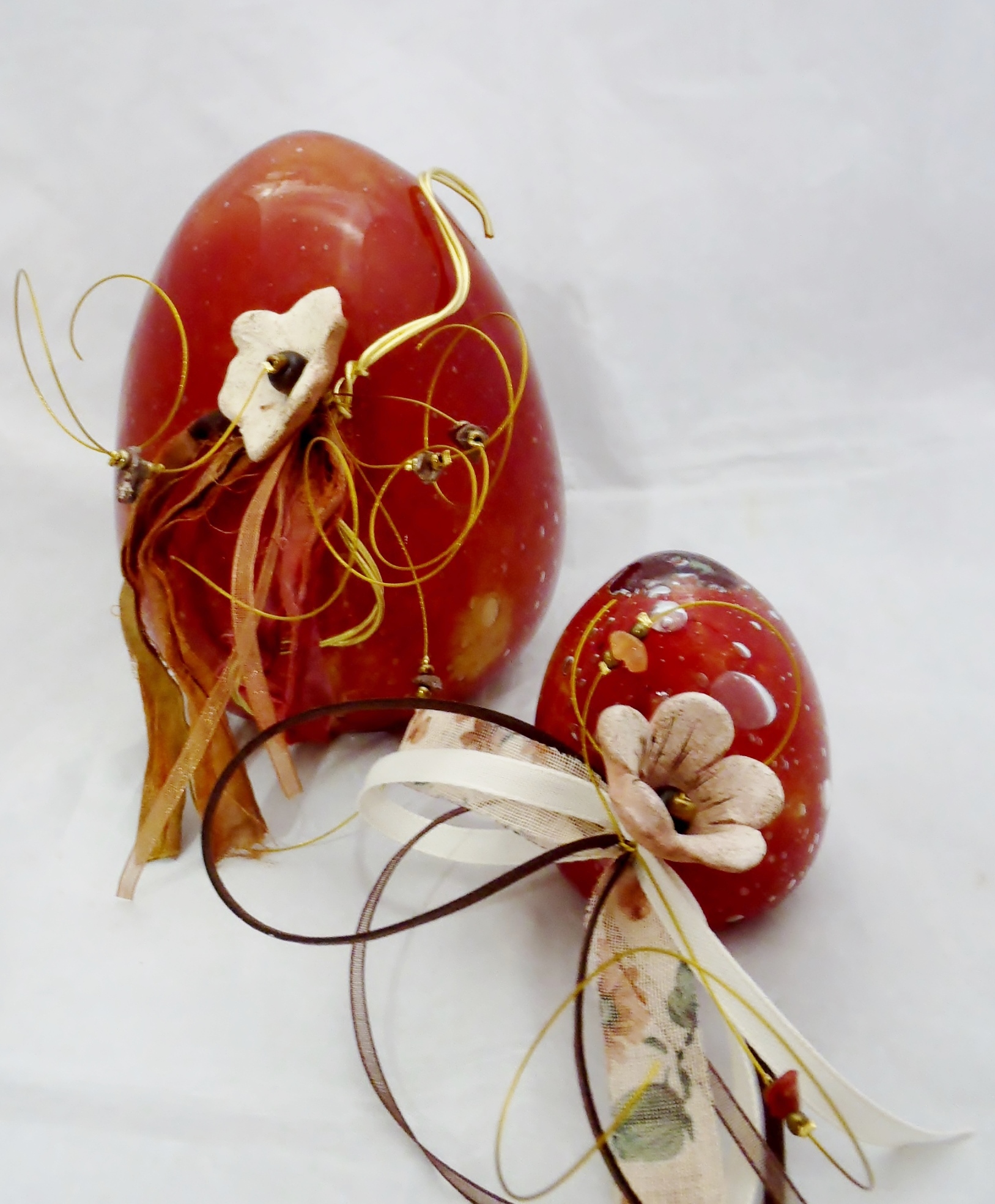 Χειροποίητα αυγά κατασκευασμένα από φυσητό γυαλί σε χρώμα μπορντό-ώχρα και σε τρεις διαστάσεις με διακόσμηση από κεραμικά και μπρούτζινα στοιχεία ή χωρίς διακόσμηση,