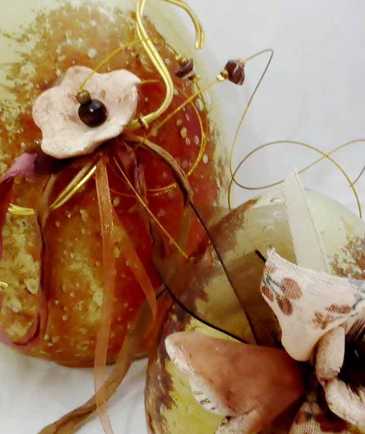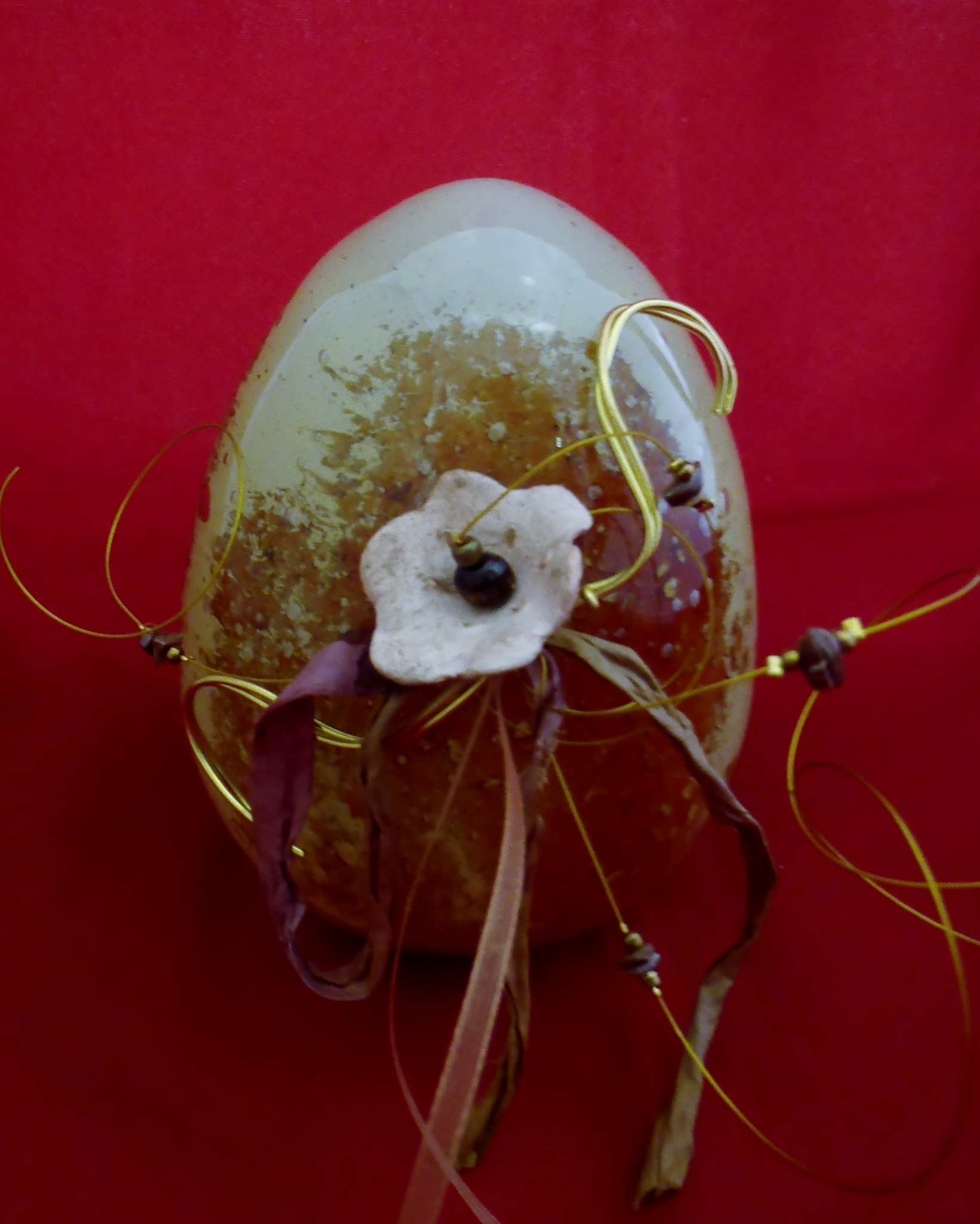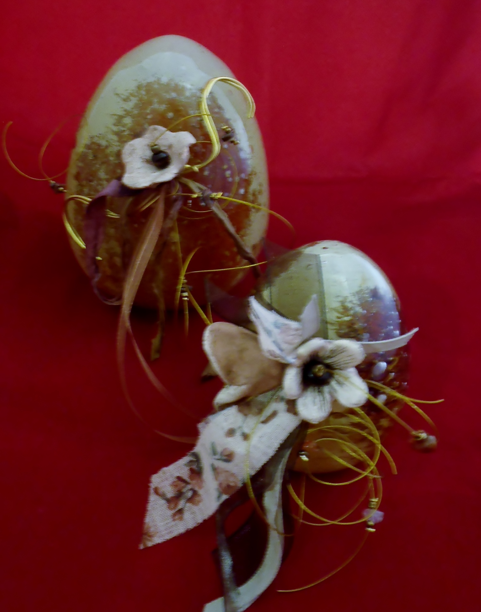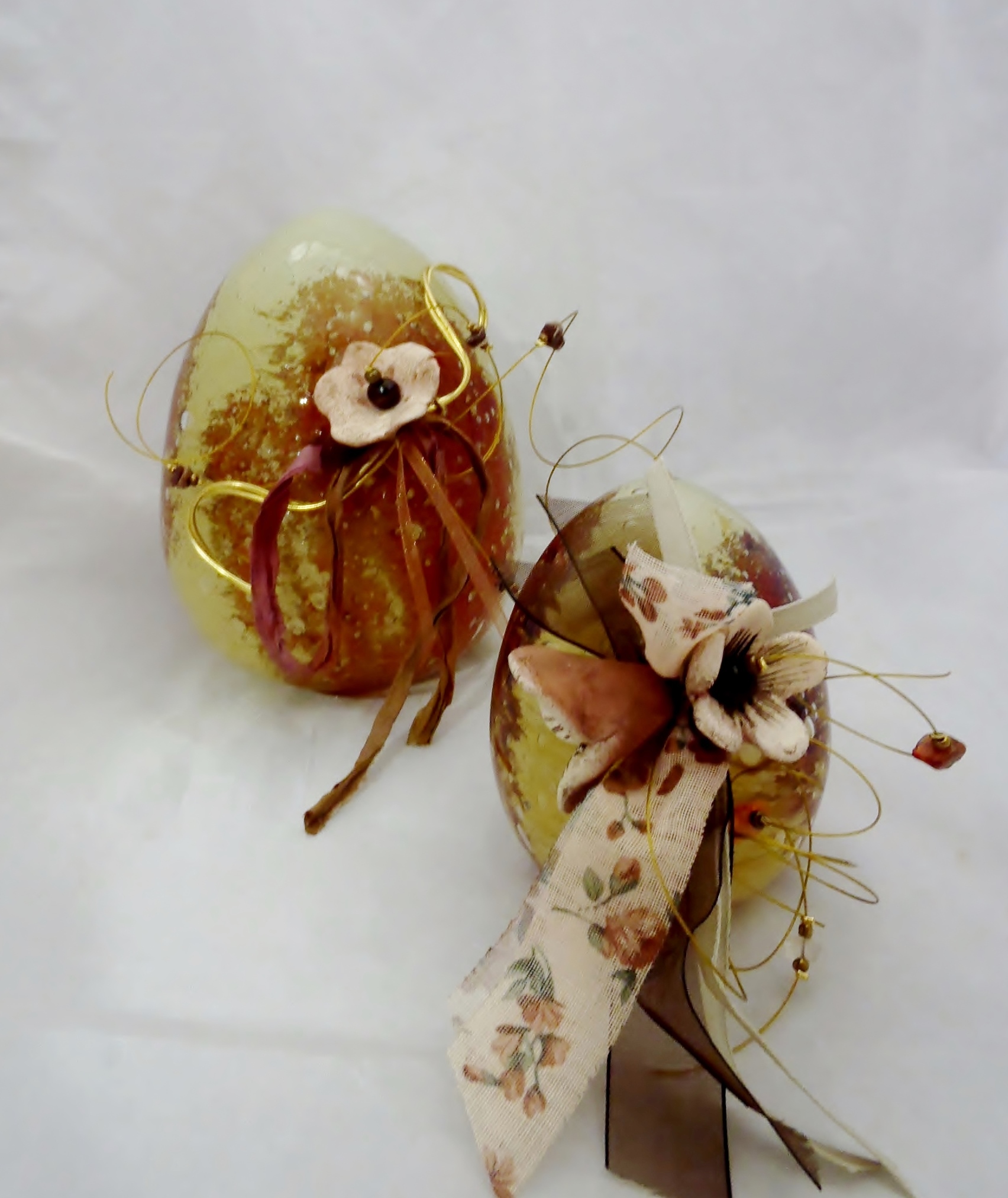 Χειροποίητα αυγά κατασκευασμένα από φυσητό γυαλί σε διχρωμία και σε τρεις διαστάσεις με διακόσμηση  από κεραμικά και μπρούτζινα στοιχεία ή χωρίς διακόσμηση,
