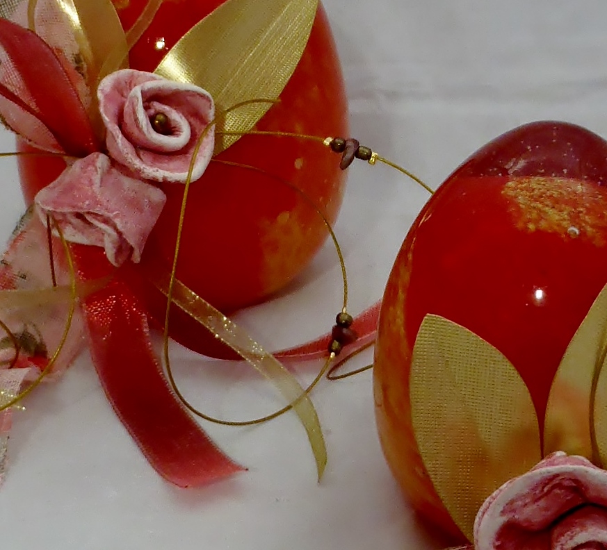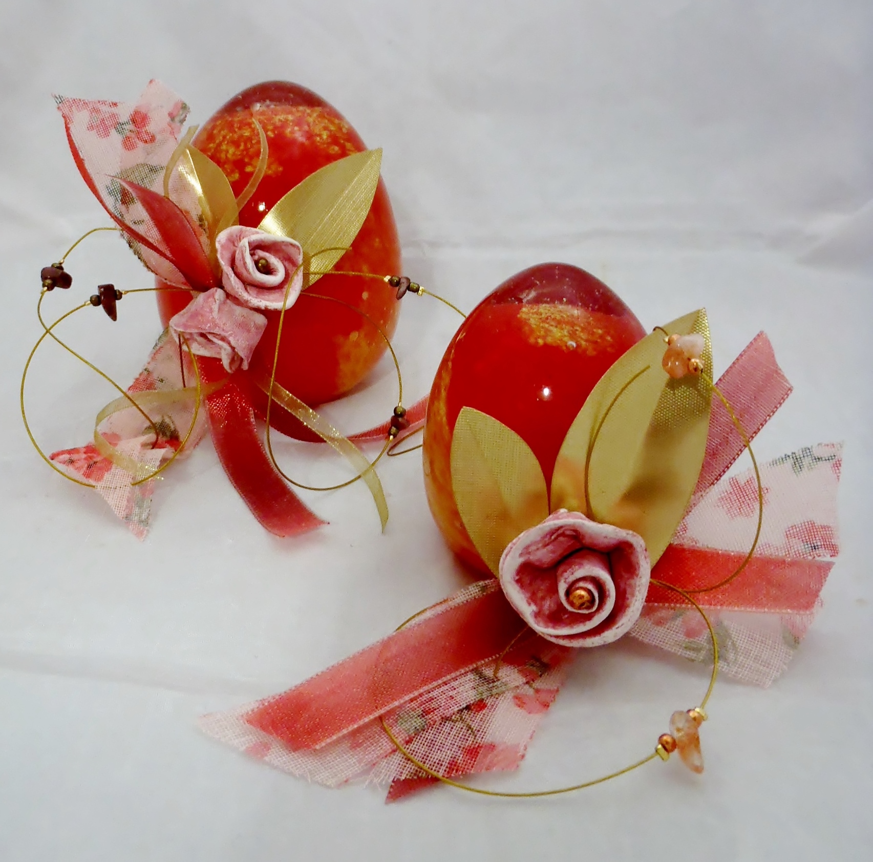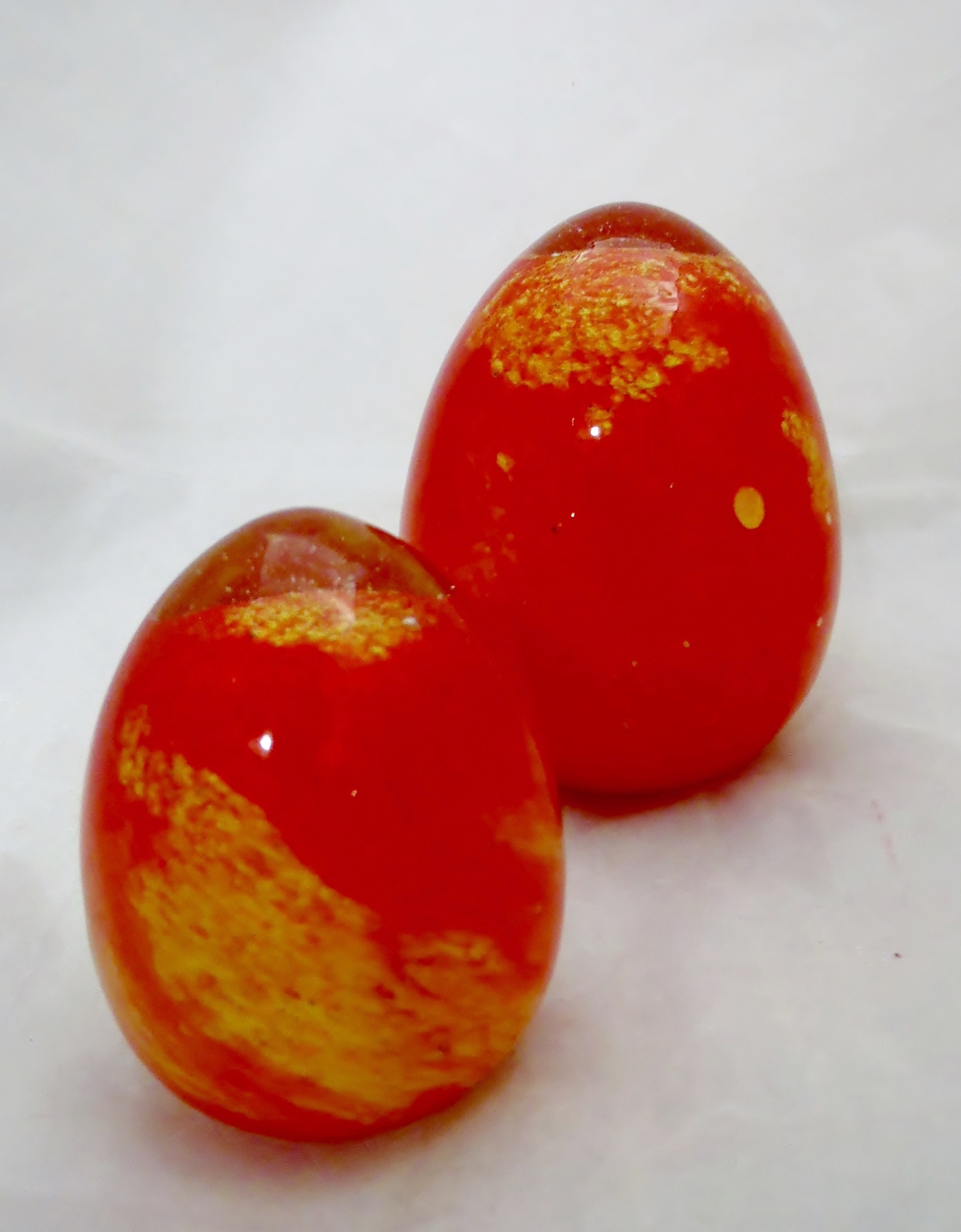 Χειροποίητα αυγά κατασκευασμένα από φυσητό γυαλί σε χρώμα κόκκινο-ώχρα και σε τρεις διαστάσεις με διακόσμηση από κεραμικά και μπρούτζινα στοιχεία ή χωρίς διακόσμηση,