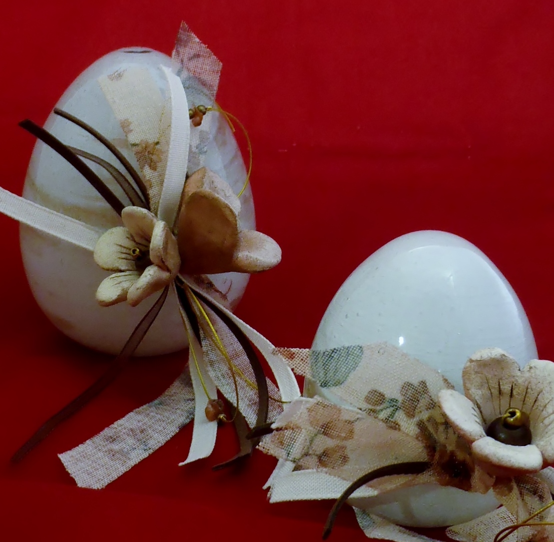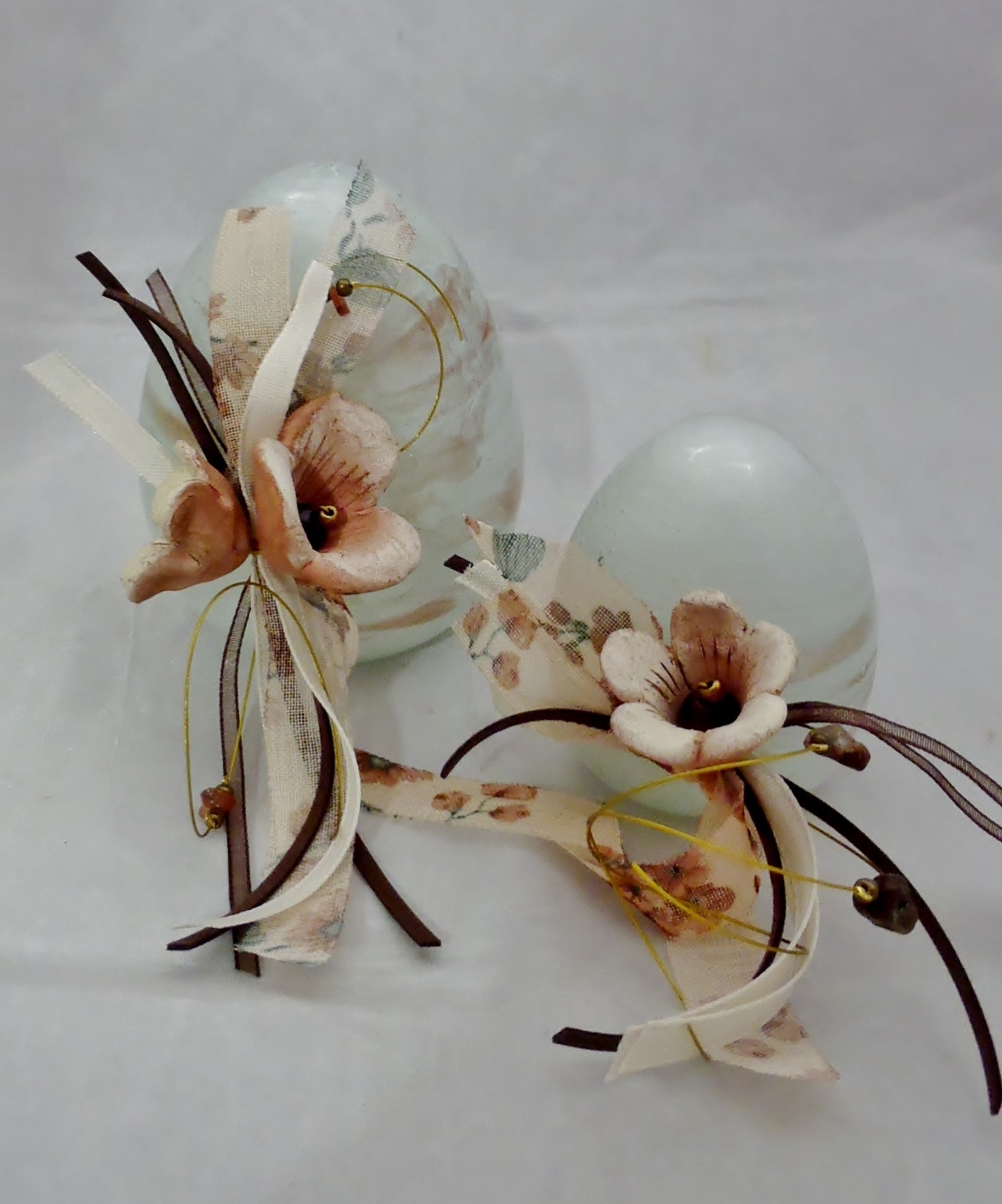Χειροποίητα αυγά κατασκευασμένα από φυσητό γυαλί σε  χρώμα Λευκό Διχρωμία  και σε τρεις διαστάσεις με διακόσμηση  από κεραμικά και μπρούτζινα στοιχεία ή χωρίς διακόσμηση,