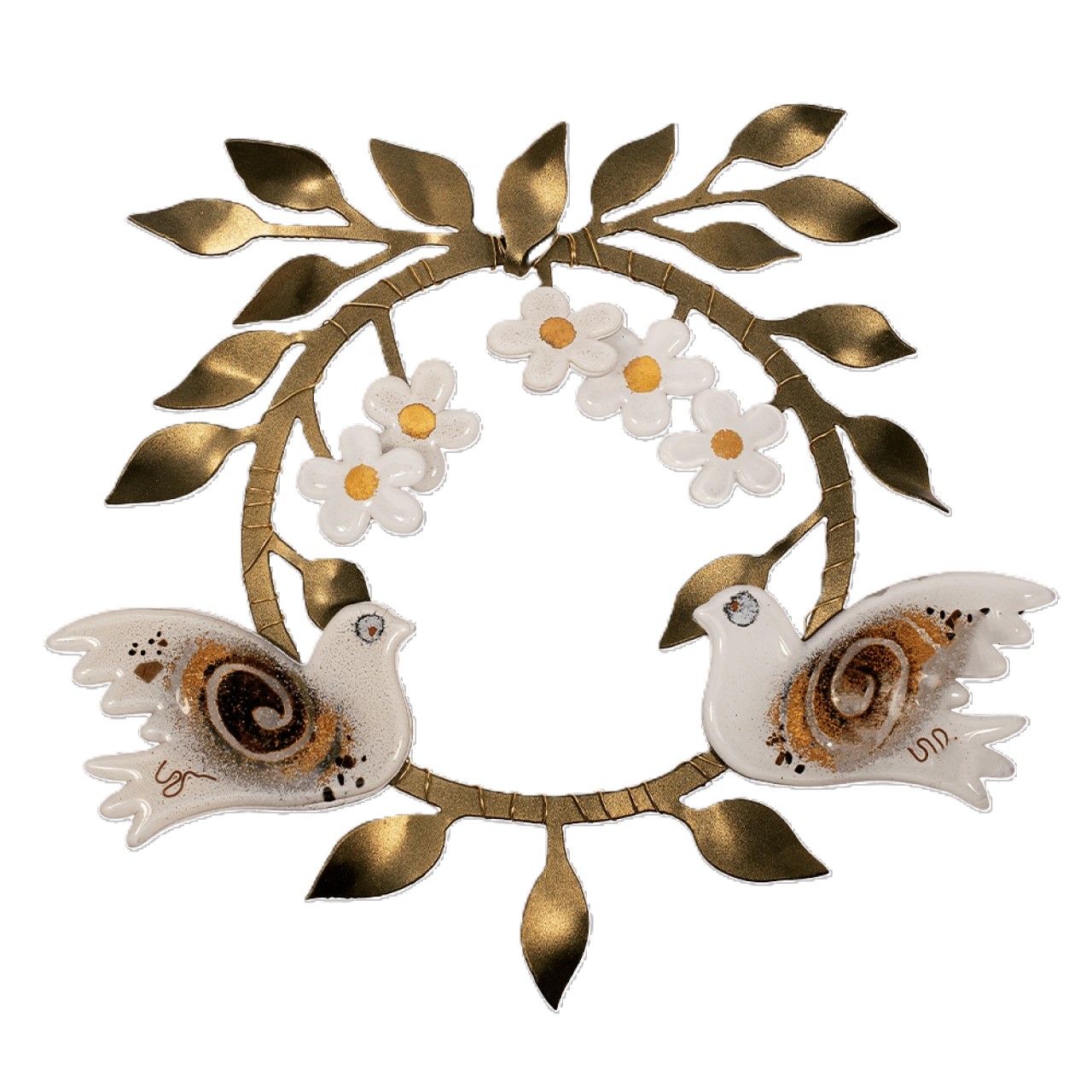 Χειροποίητο διακοσμητικό τοίχου στεφάνι μπρούτζινο με περιστεράκια από φυσητό γυαλί σε διάσταση 22χ22εκ.
