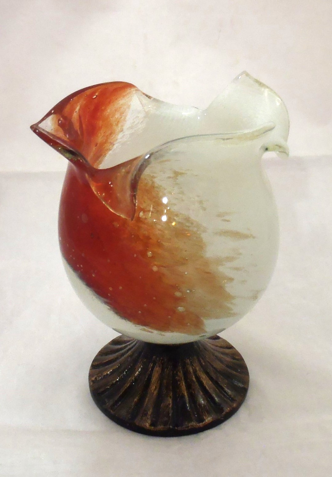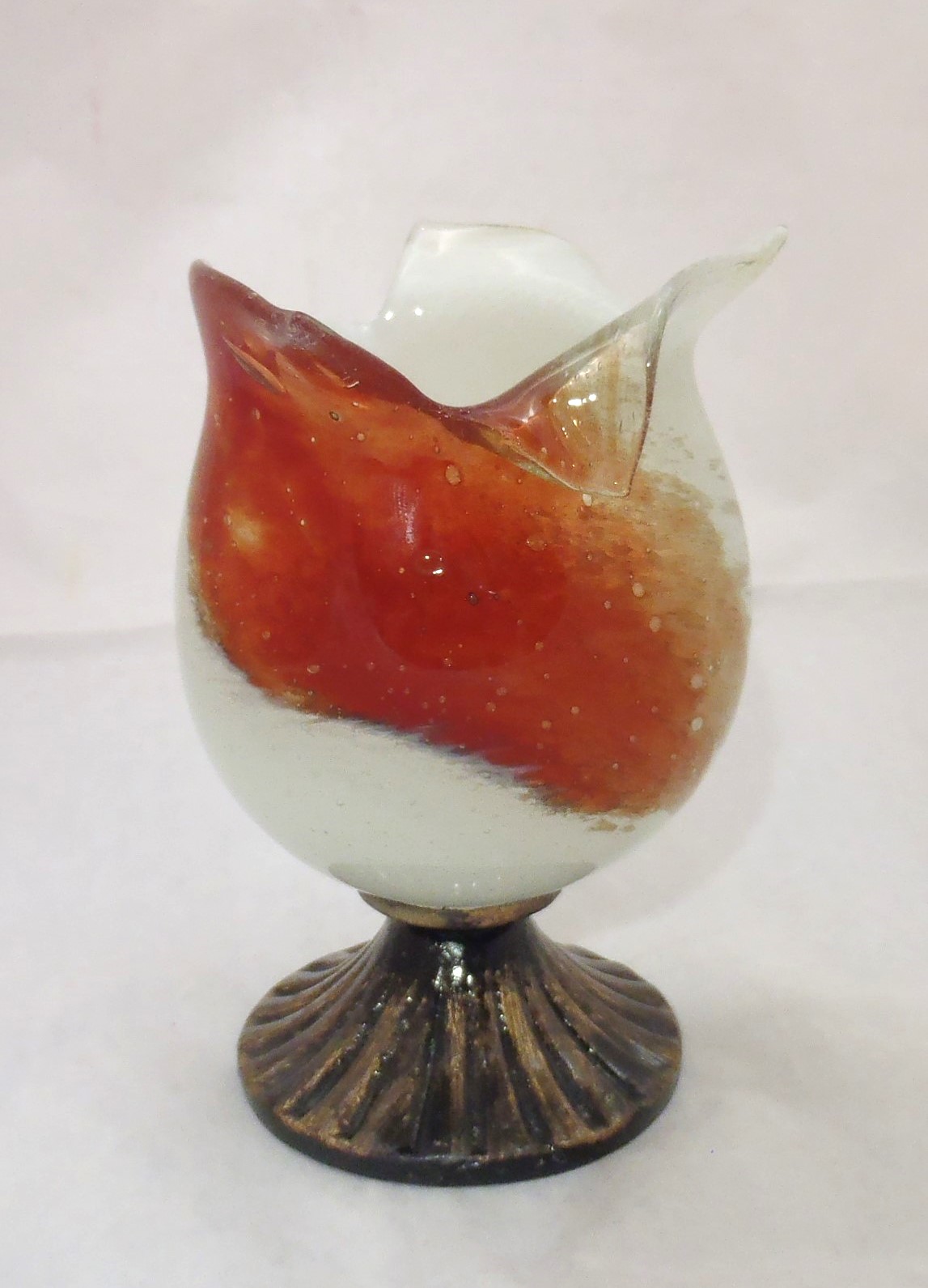Χειροποίητο επιτραπέζιο  κηροπήγιο από  φυσητό γυαλί σε βάση  από μπρούτζο σε χρώμα κόκκινο-λευκό  και διάσταση 14χ9εκ.