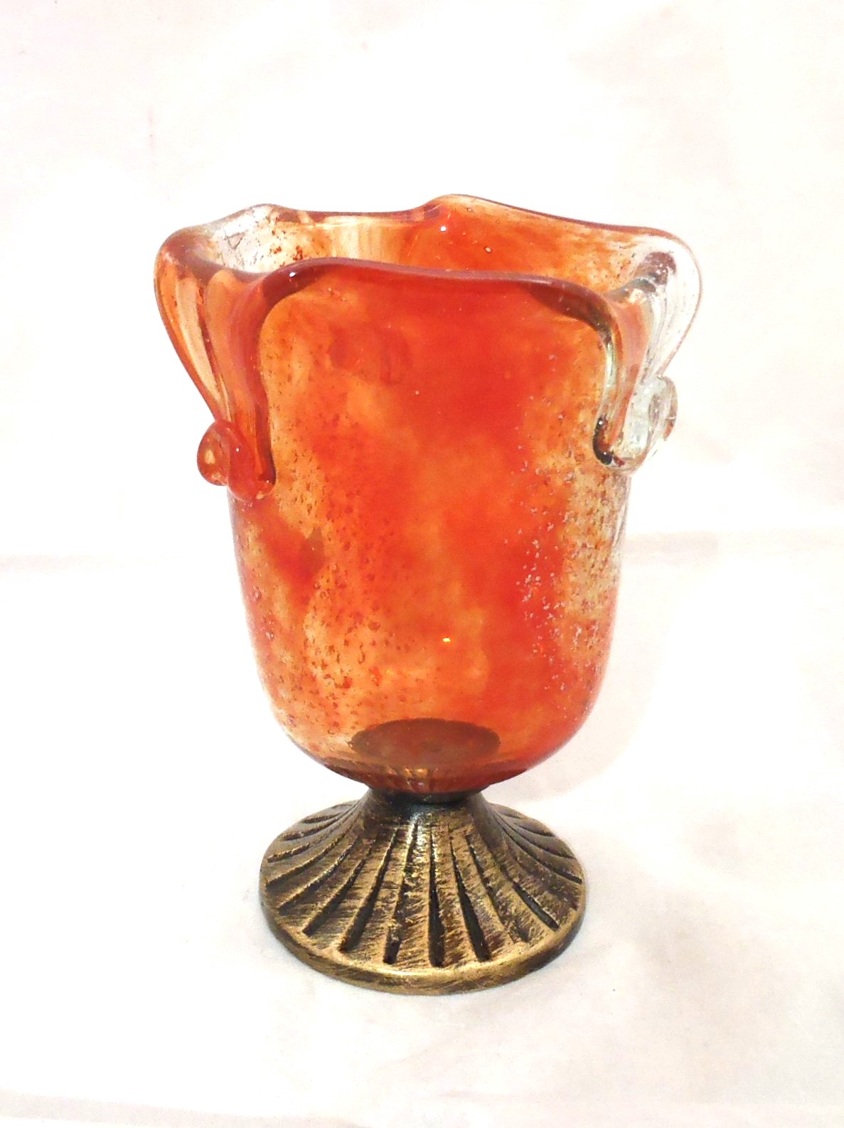 Χειροποίητο κηροπήγιο κατασκευασμένο από φυσητό γυαλί σε χρώμα κόκκινο διάφανο και μπρούτζινη βάση σε διάσταση 15χ10εκ.