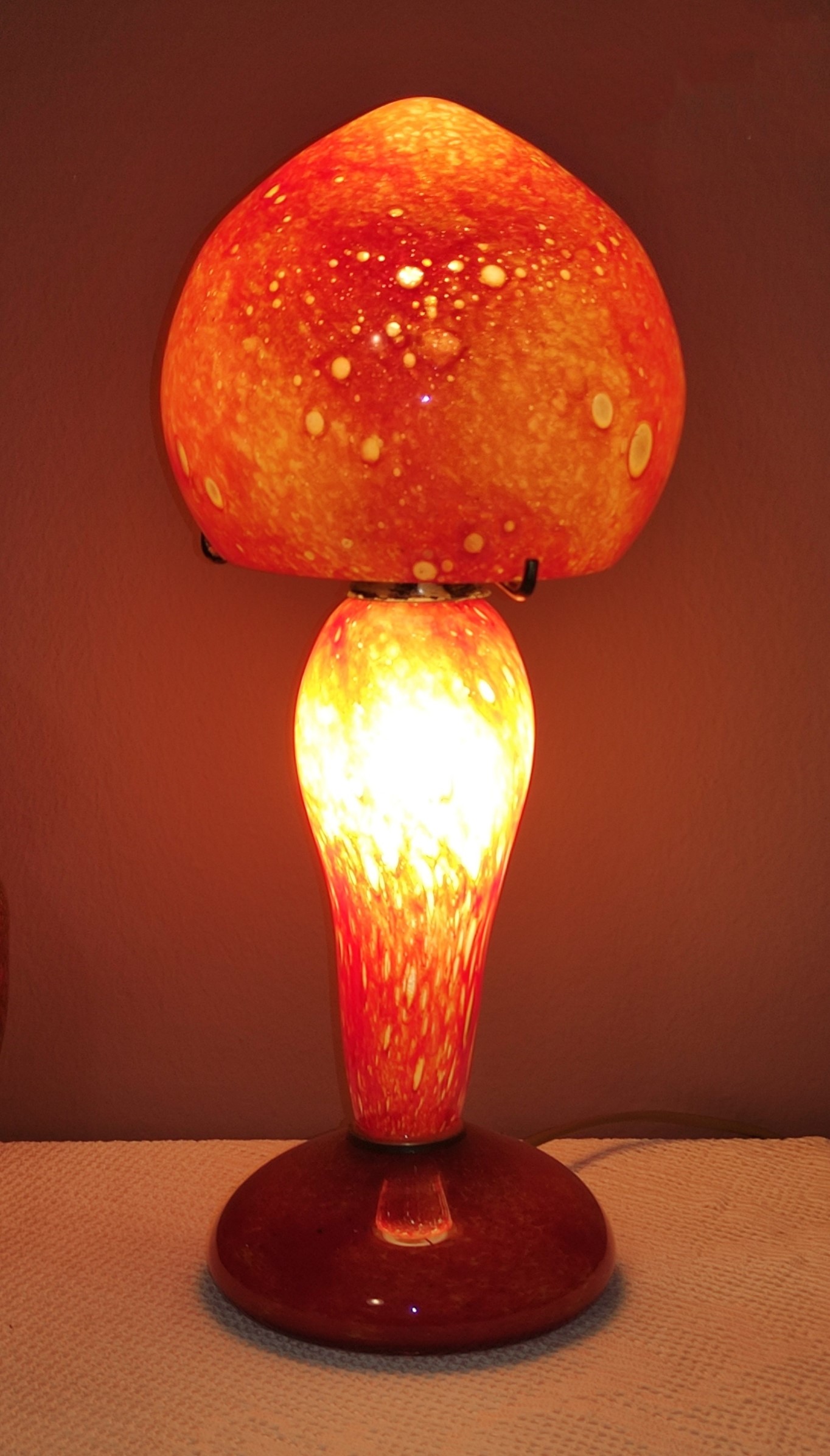 Χειροποίητο φωτιστικό από φυσητό γυαλί διαμέτρου Φ16εκ. και γυάλινη βάση συνολικού ύψους 38εκ. Ε14. Υπάρχει η δυνατότητα επιλογής χρώματος γυαλιού