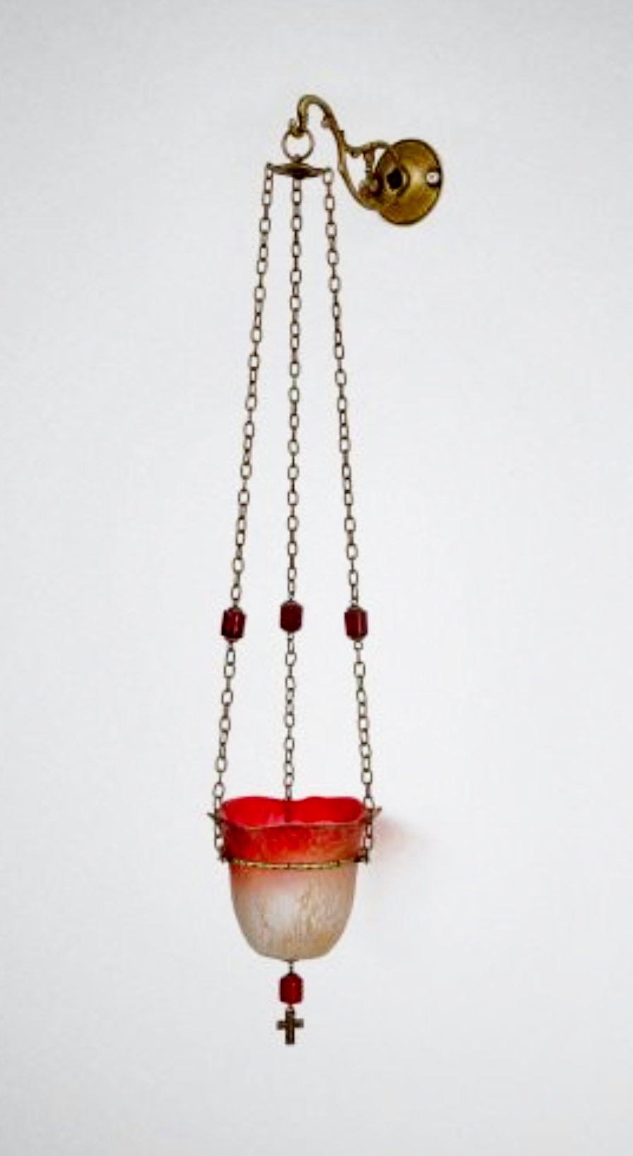 Χειροποίητο κρεμαστό καντηλάκι σε σχέδιο γυαλιού αράχνη σε διάφορα χρώματα και διάσταση 11χ10εκ. ελληνικής κατασκευής και μπρούτζινη αλυσίδα σε διάσταση ύψους 50εκ. Η μπρούτζινη βάση τοίχου δεν περιλαμβάνεται.