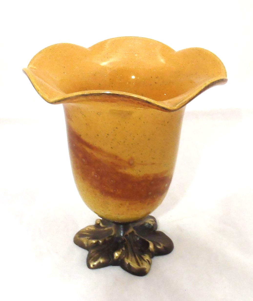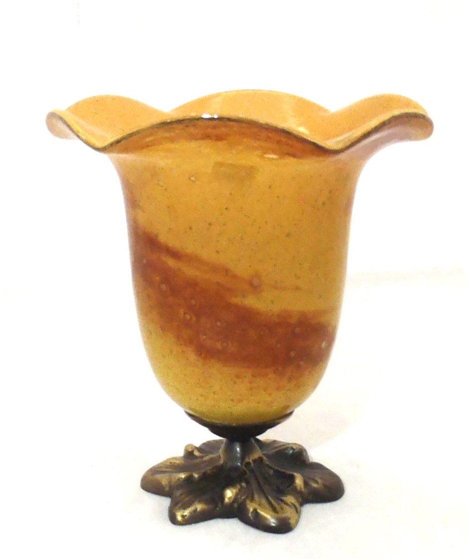 Χειροποίητο επιτραπέζιο κηροπήγιο από φυσητό γυαλί σε χρώμα καφέ-ώχρα με μπρούτζινη βάση και διάσταση 12χ11εκ.