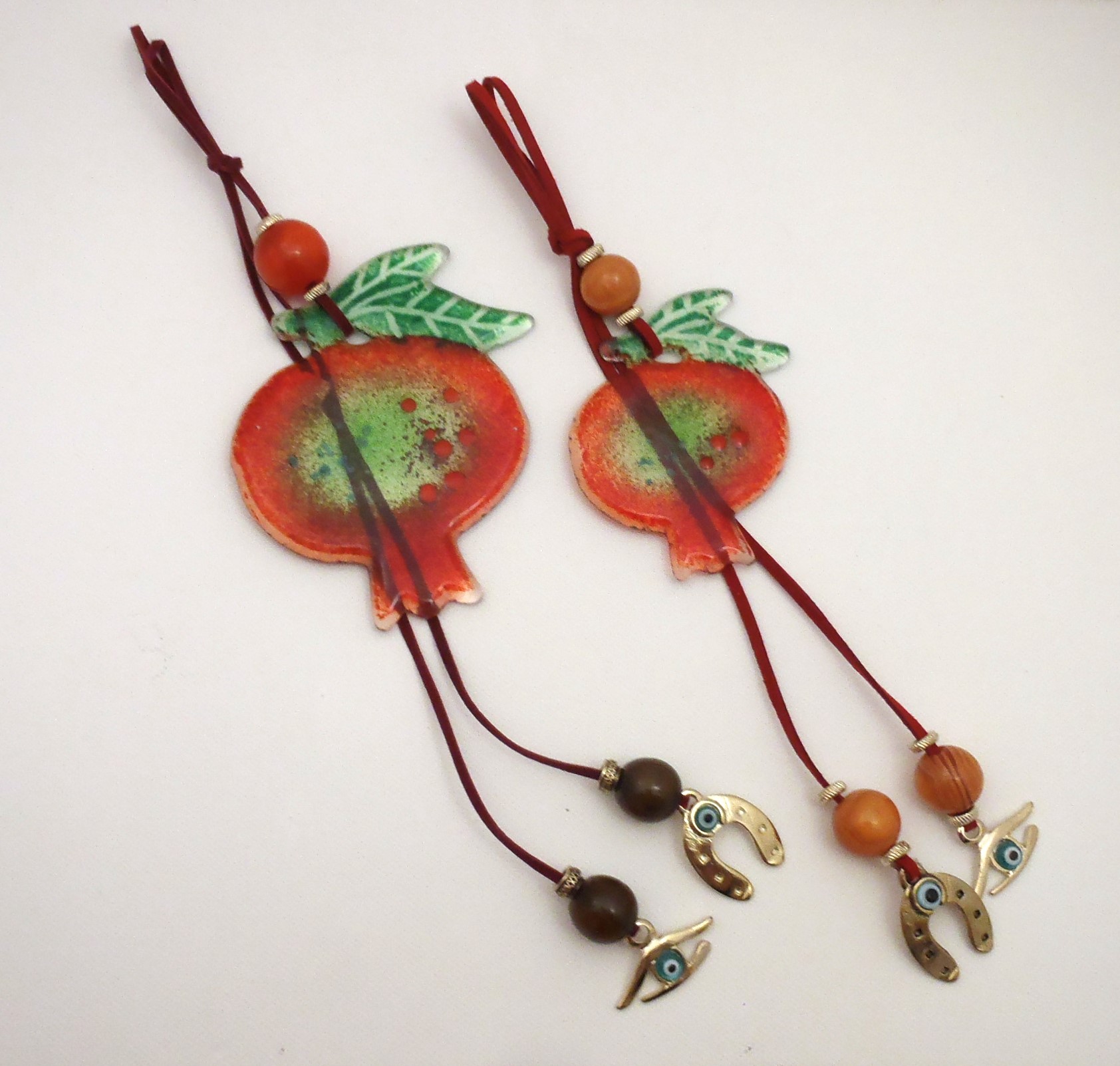 Χειροποίητο κρεμαστό γούρι σε σχήμα ροδιού. Αποτελείται από φυσητό γυαλί και μπρούτζινα στοιχεία σε δύο διαστάσεις