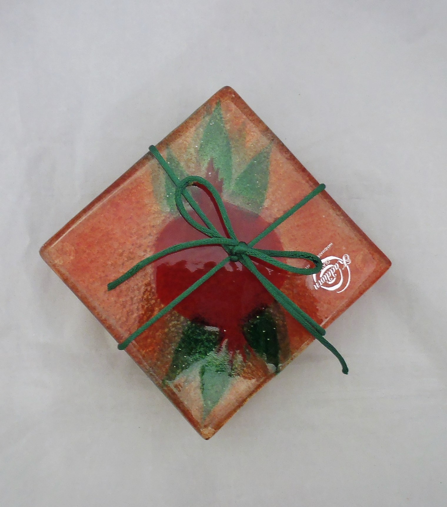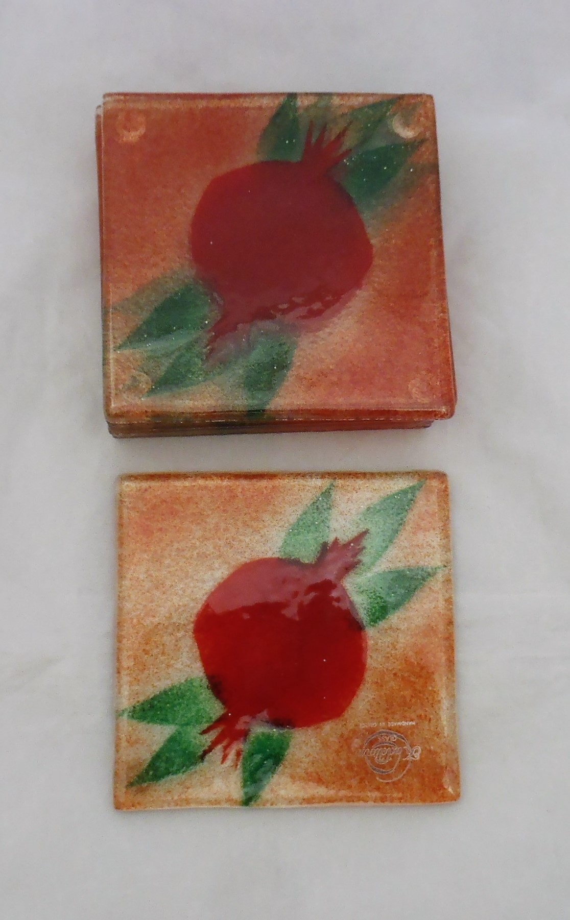 Χειροποίητο σουβέρ κατασκευασμένο από φυσητό γυαλί με σχέδιο ρόδια σε 4/δα και 6/δα και διάσταση 10χ10εκ.