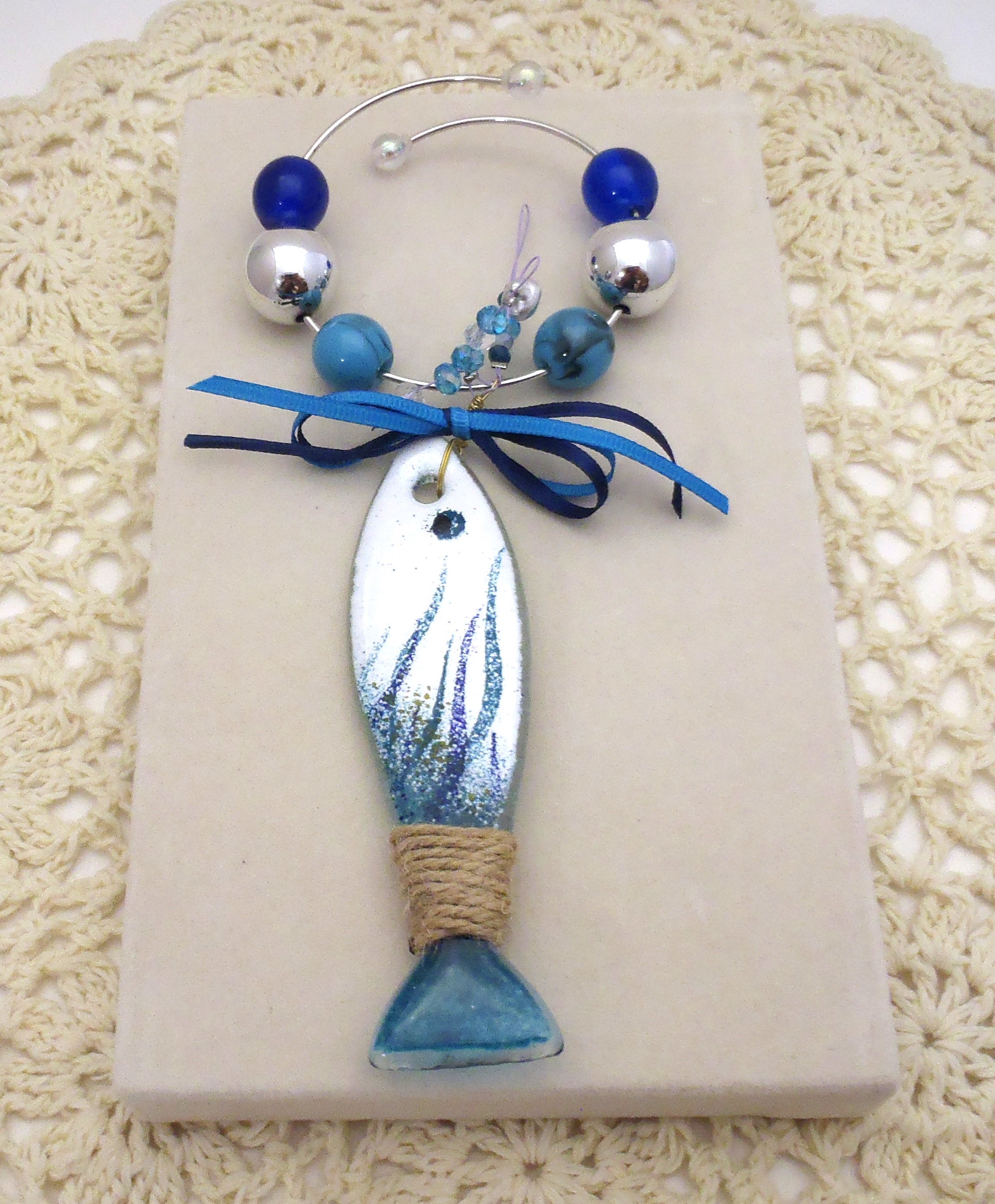 Χειροποίητο στεφανάκι γούρι με πέτρες και ψαράκι από φυσητό γυαλί σε διάσταση 19χ9εκ.