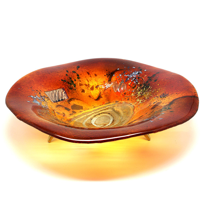 Χειροποίητη πιατέλα στρογγυλή από φυσητό γυαλί ελληνικής κατασκευής με μπρούτζινα ποδαράκια