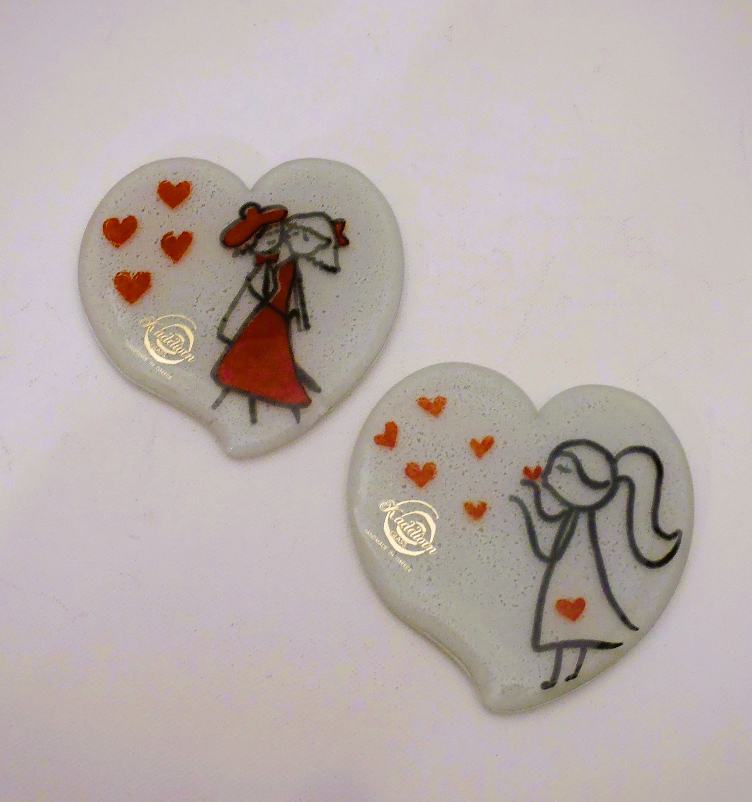 Χειροποίητο σουβέρ σε σχέδιο καρδιά ζωγραφισμένο με δύο διαφορετικές παραστάσεις σε διάσταση 10χ10εκ. σε σετ των δύο τεμαχίων και σετ των τεσσάρων τεμαχίων.