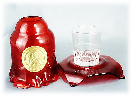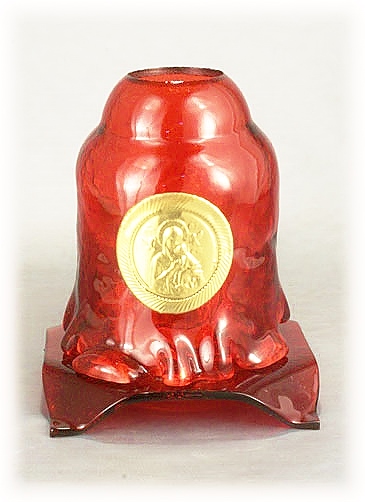 Χειροποίητο επιτραπέζιο καντηλάκι ελληνικής κατασκευής σε κόκκινο χρώμα από φυσητό γυαλί με ποτηράκι στο εσωτερικό του και θόλο με μεταλλική εικόνα της Παναγίας κλειστό επαρκώς αεριζόμενο σε διάσταση 14,5χ12χ12εκ. διατίθεται  σε διάφορα χρώματα.