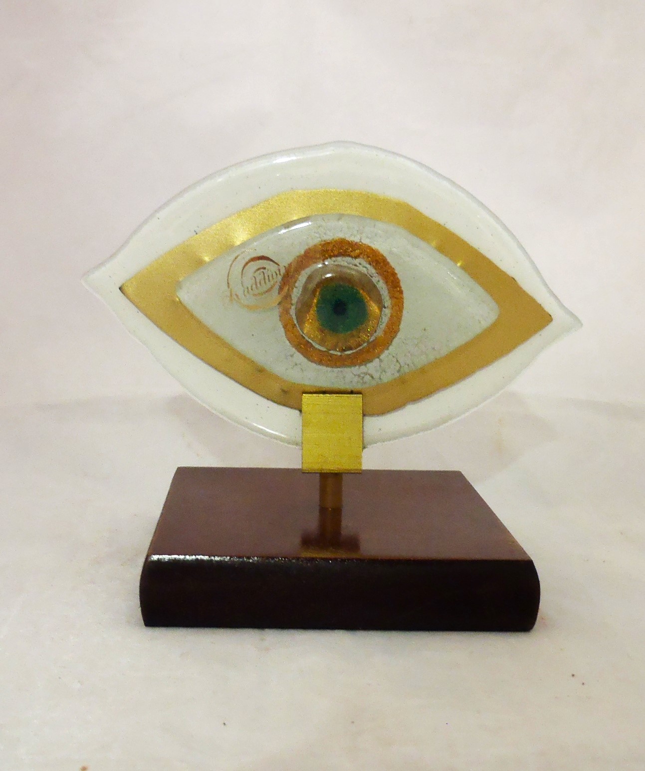 Χειροποίητο επιτραπέζιο γούρι μάτι κατασκευασμένο από φυσητό γυαλί και μπρούτζο τοποθετημένο σε ξύλινη βάση και σε διάσταση 12χ13χ9εκ.