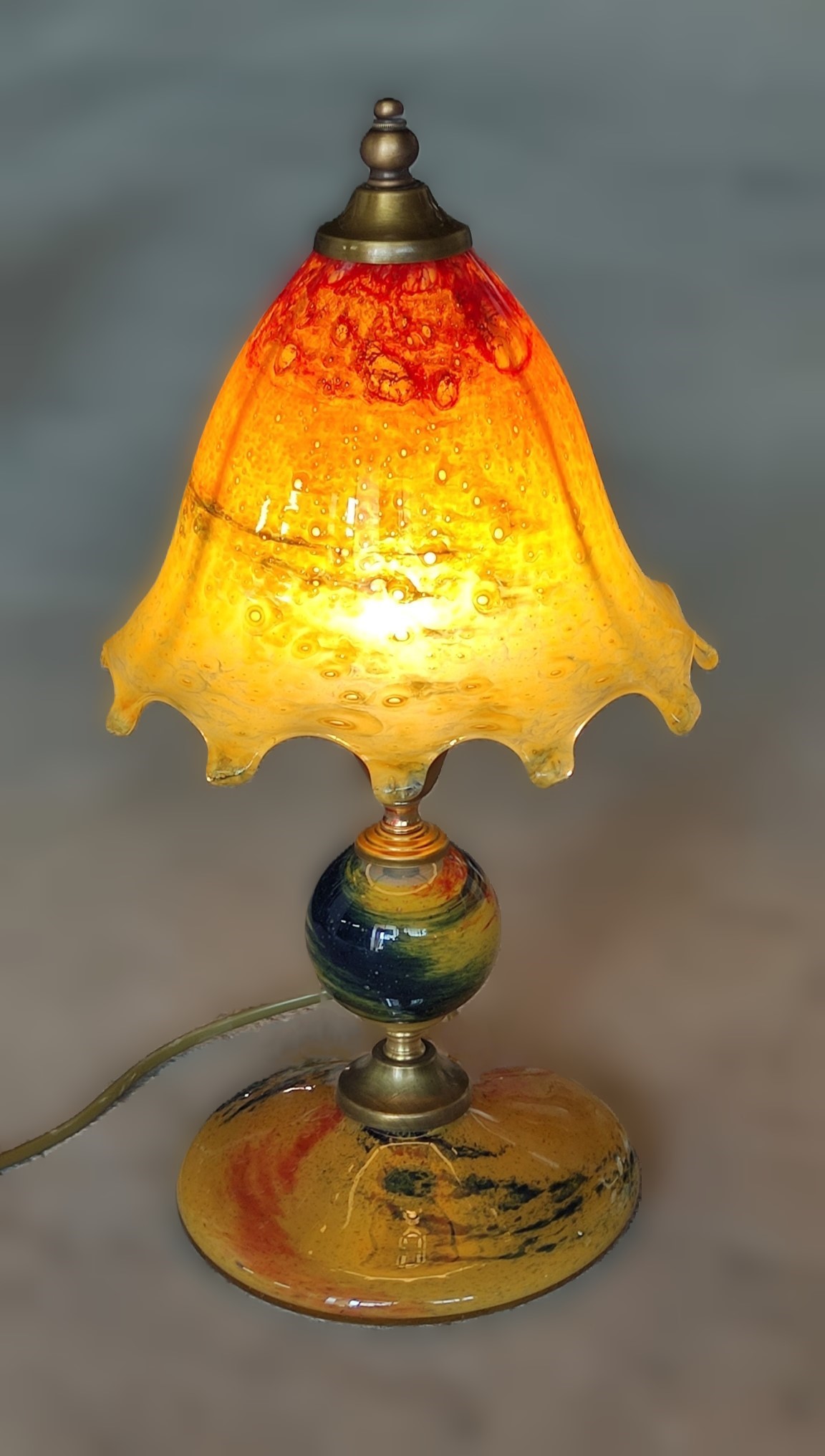 Χειροποίητο φωτιστικό από φυσητό γυαλί διαμέτρου Φ20εκ. και δεμένο με μπρούτζινα στοιχεία συνολικού ύψους 37εκ.