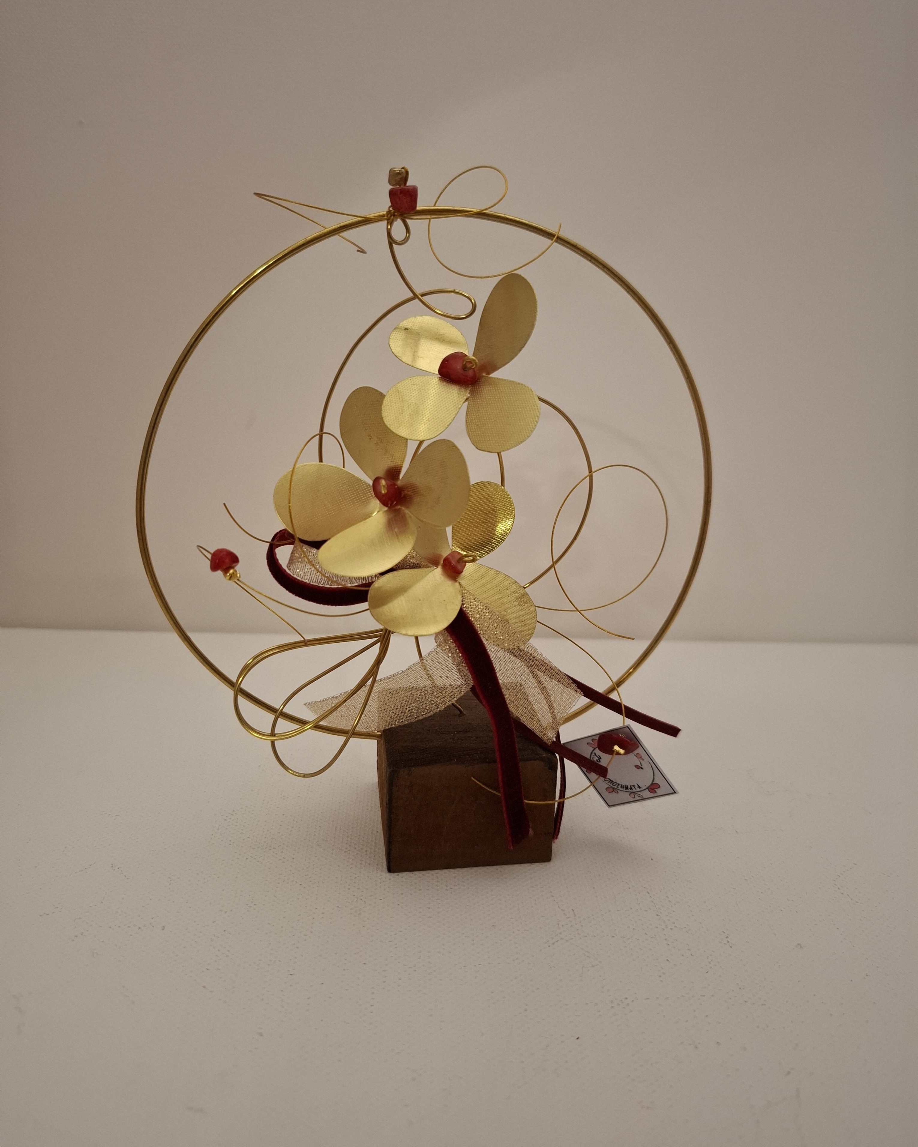 Χειροποίητο διακοσμητικό στεφάνι από μπρούτζινα λουλούδια τοποθετημένο σε ξύλινη βάση και σε διάσταση 15χ15εκ