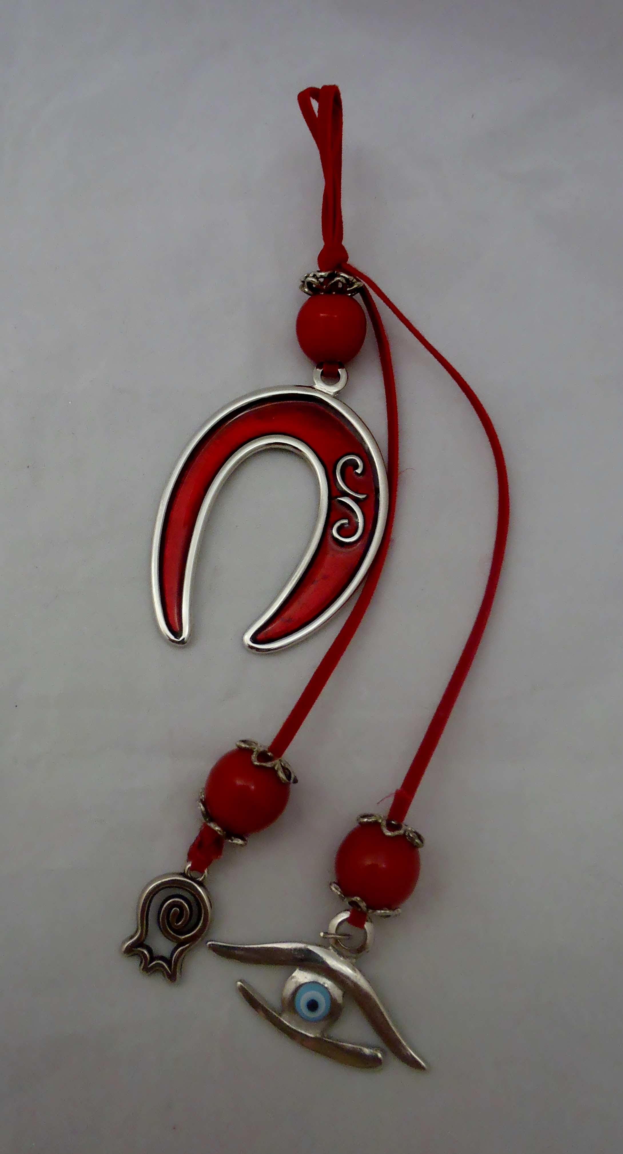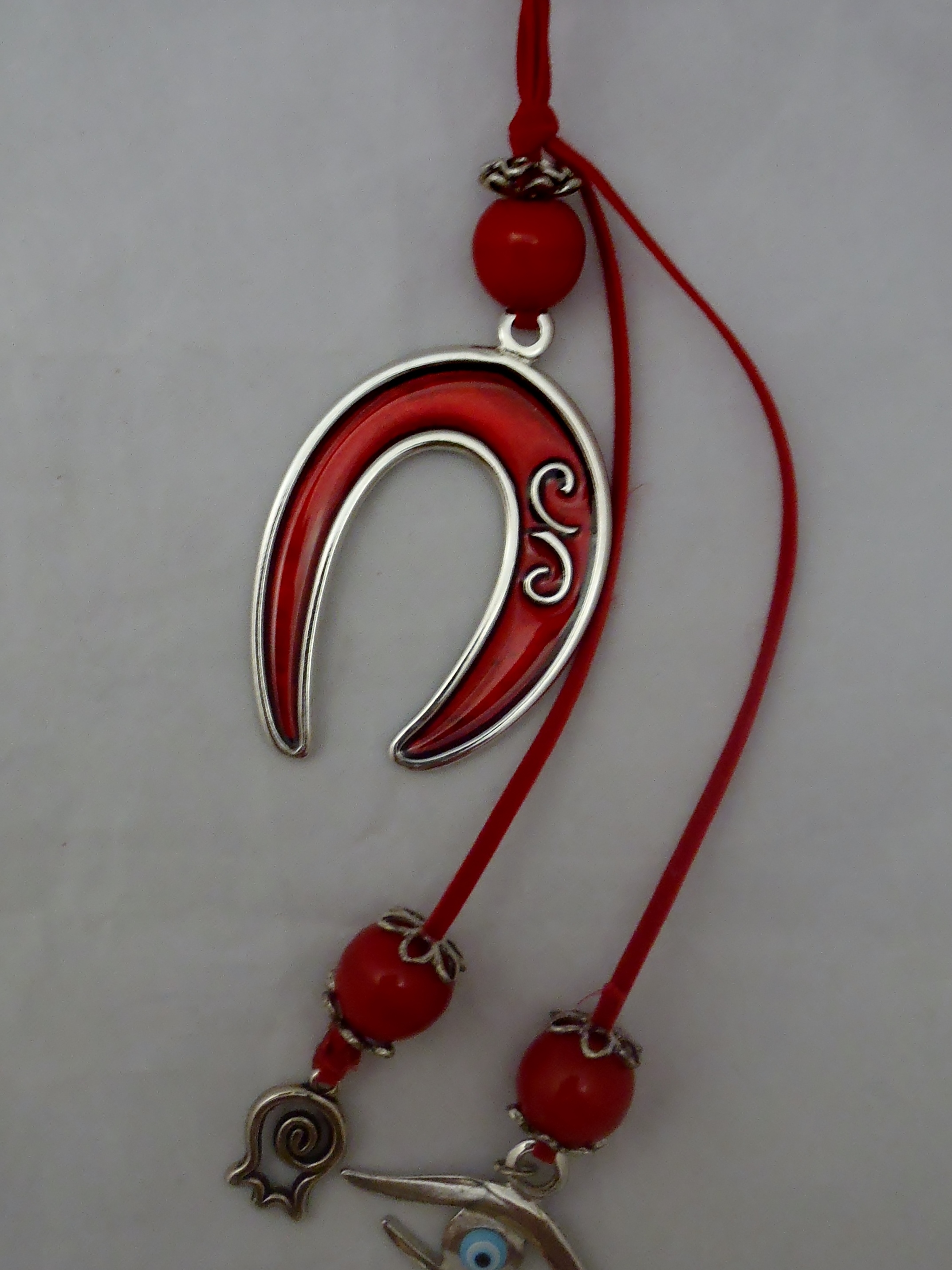 Χειροποίητο γούρι πέταλο από μπρούτζο και γεμισμένο με σμάλτο σε κόκκινο χρώμα διακοσμημένο με μπρούτζινα στοιχεία και σε διάσταση 20χ4,5εκ.