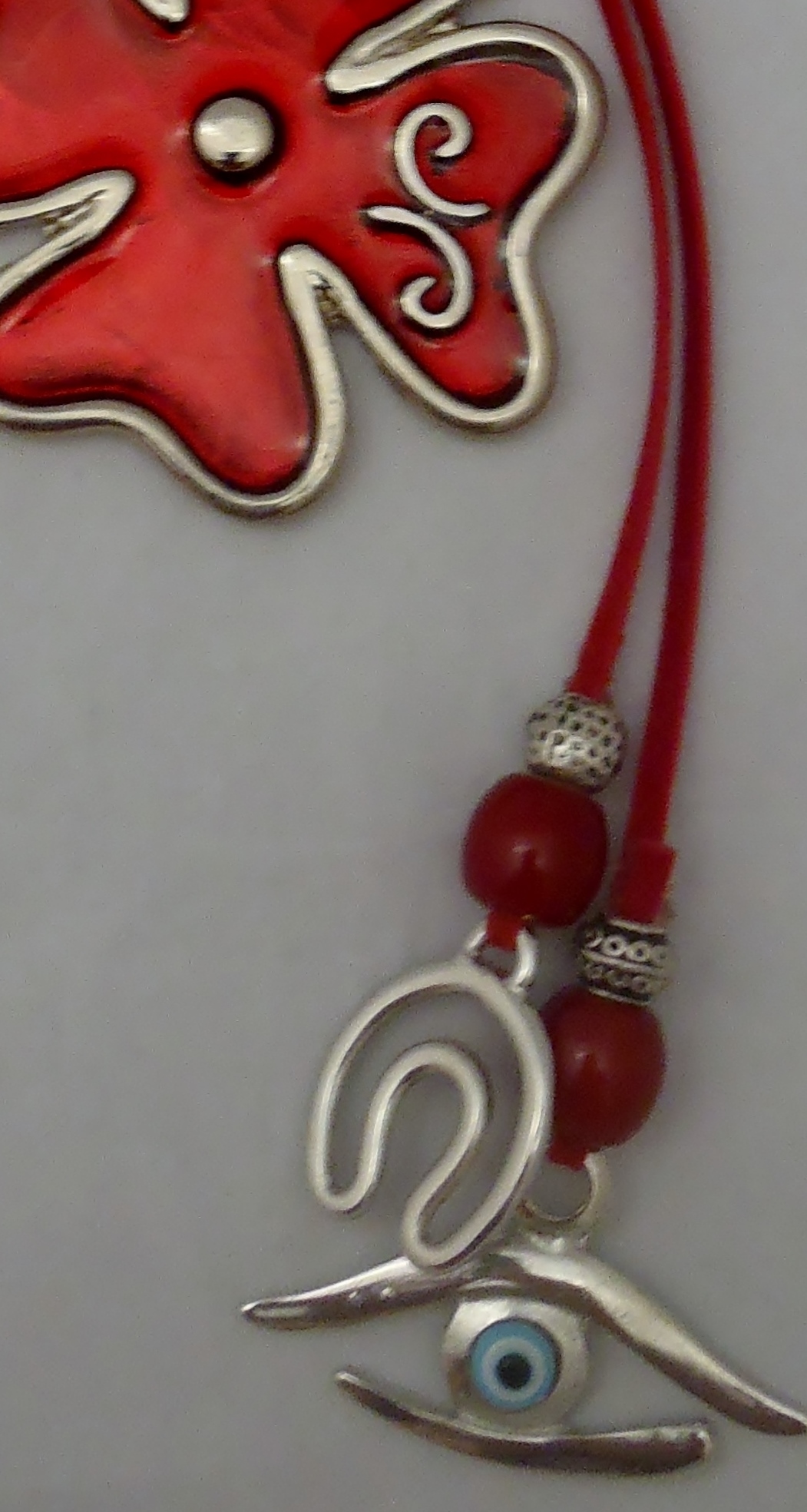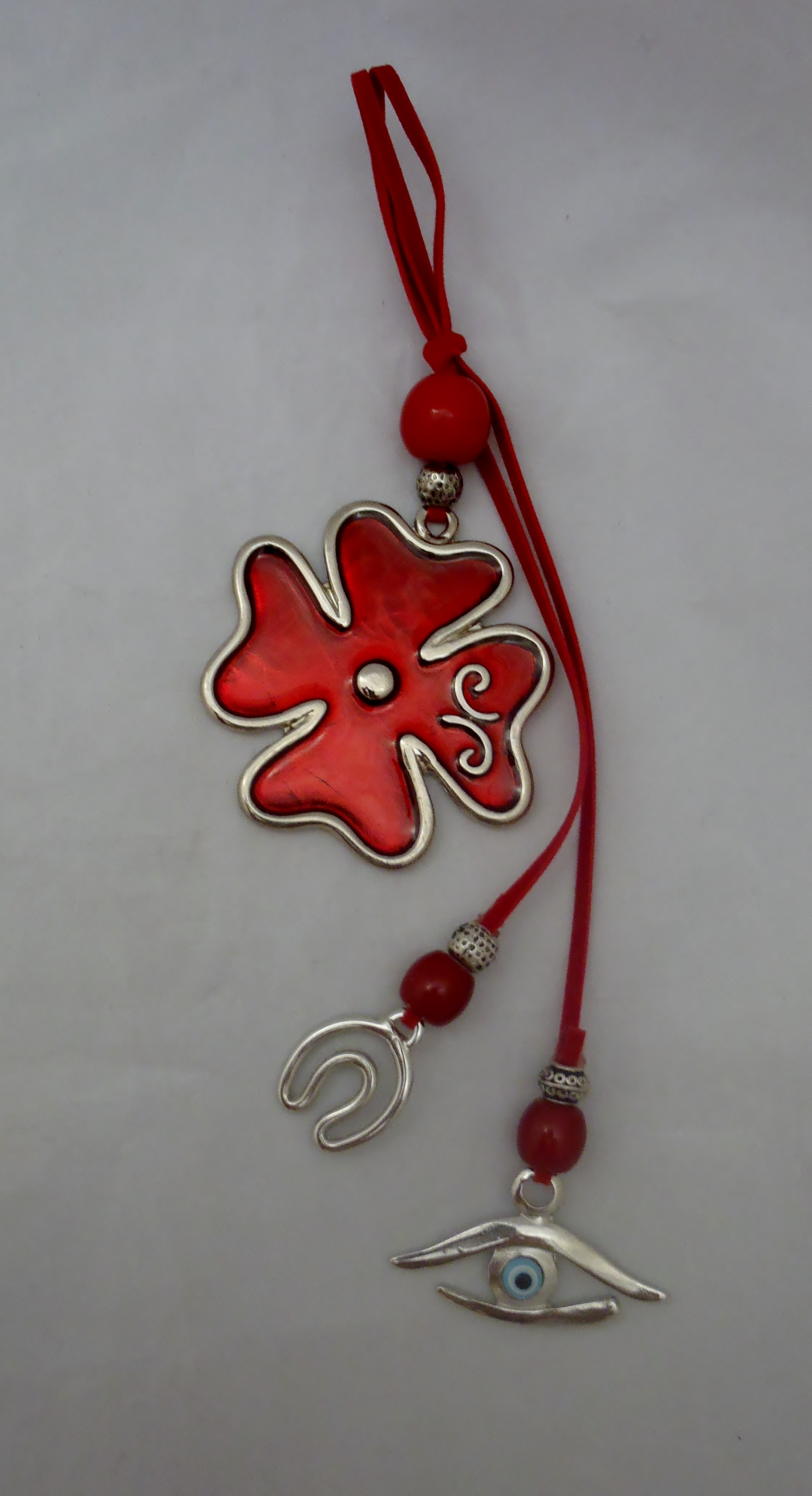 Χειροποίητο γούρι τετράφυλλο τριφύλλι κατασκευασμένο από μπρούτζο και γεμισμένο με σμάλτο σε κόκκινο χρώμα και διακοσμημένο με μπρούτζινα στοιχεία σε διάσταση 20χ6εκ.