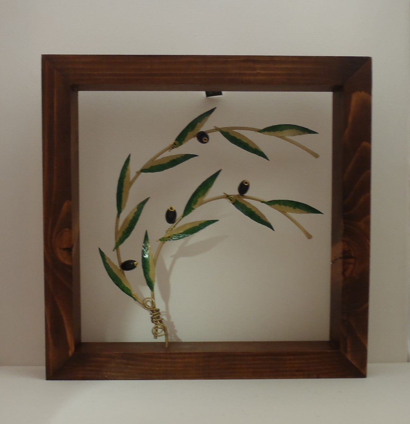 Χειροποίητο επιτοίχιο καδράκι κατασκευασμένο από ξύλινο πλαίσιο πεύκου , βαμμένο σε φυσικό χρώμα ξύλου και κατόπιν φιλοτεχνείτε στο εσωτερικό του με παράσταση από μέταλλα ορείχαλκου και σύρματα σε διάφορα σχέδια και σε διάσταση 28χ28εκ.