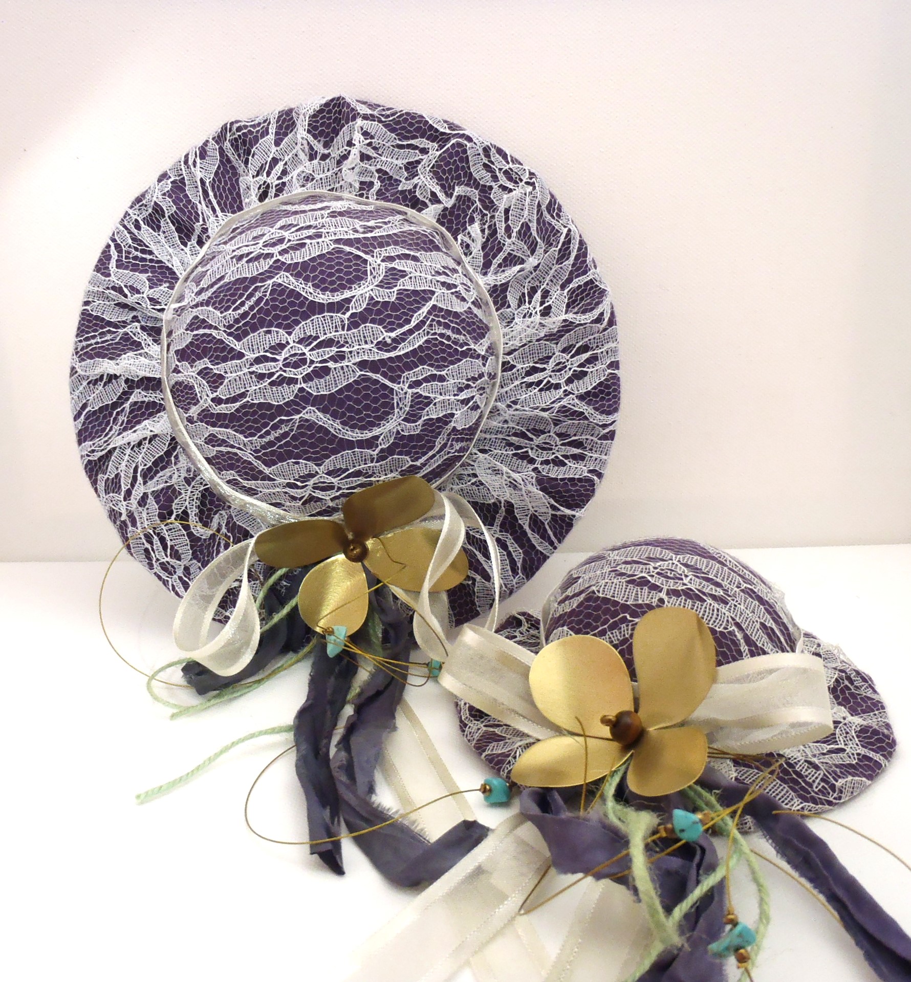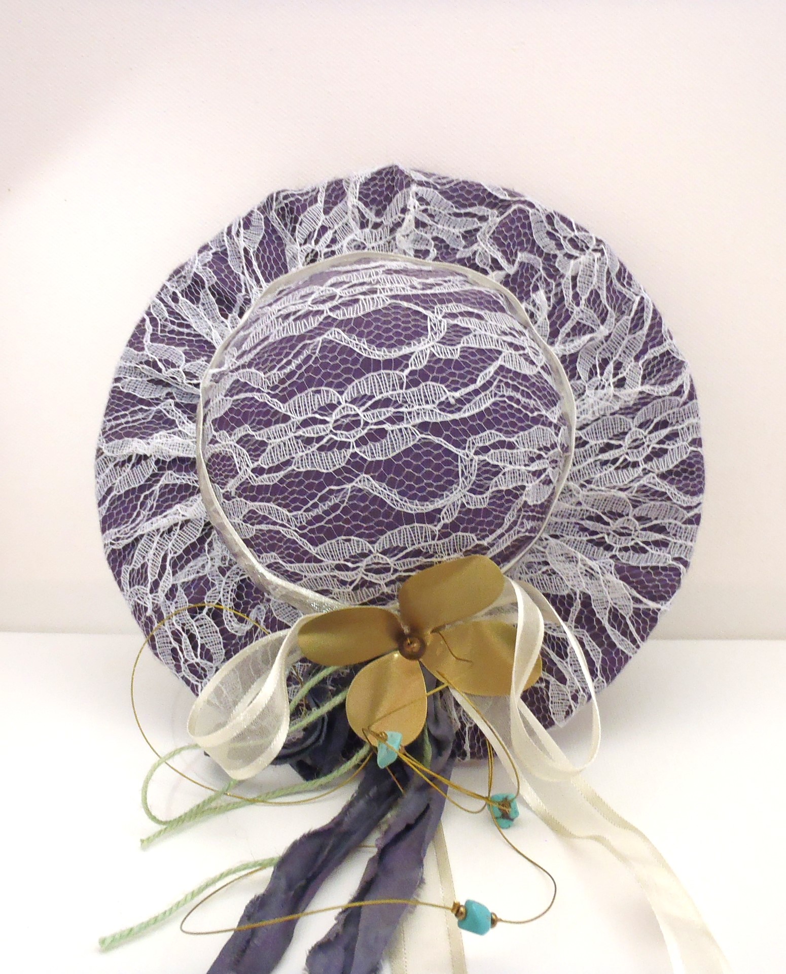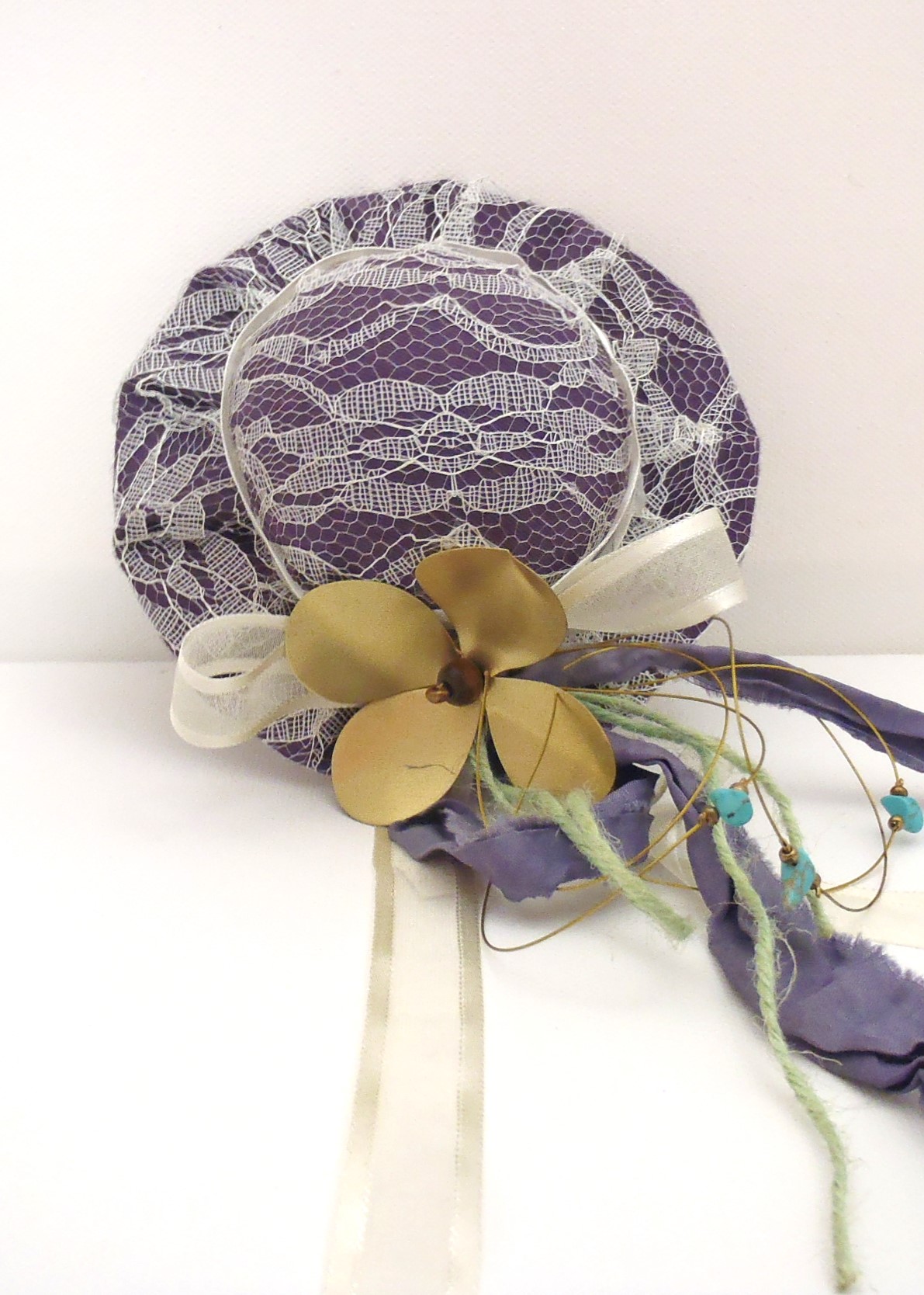 Χειροποίητο καπέλο κατασκευασμένο από ύφασμα και δαντέλα διακοσμημένο με ροδέλες και μπρουτζινά ή κεραμικά στοιχεία