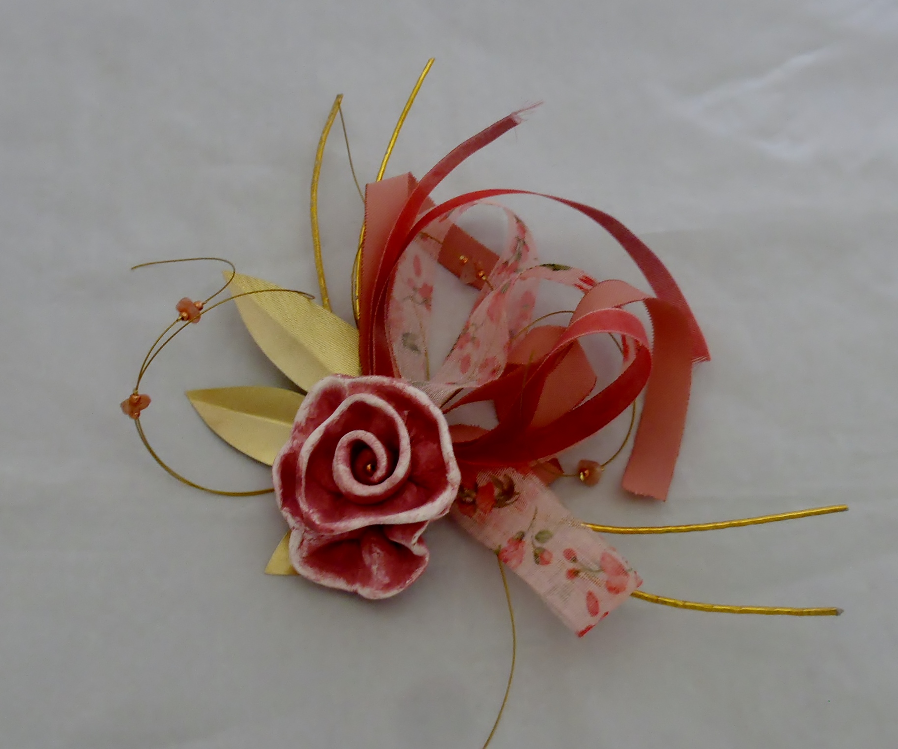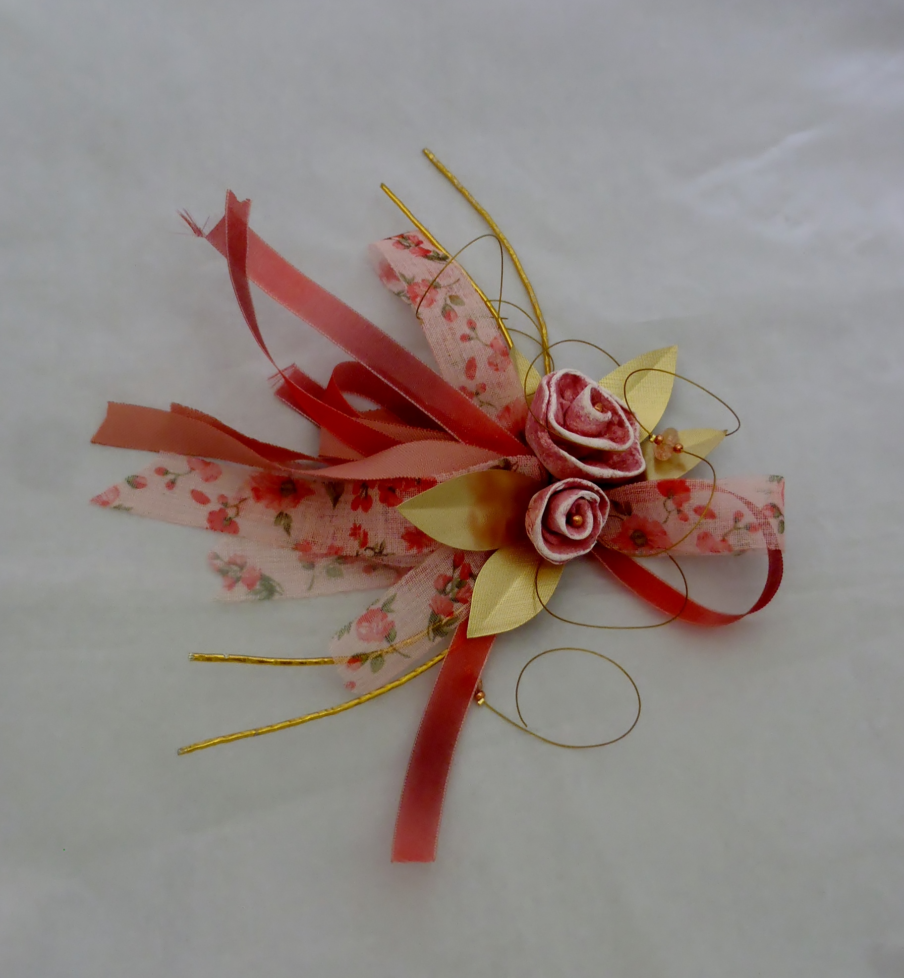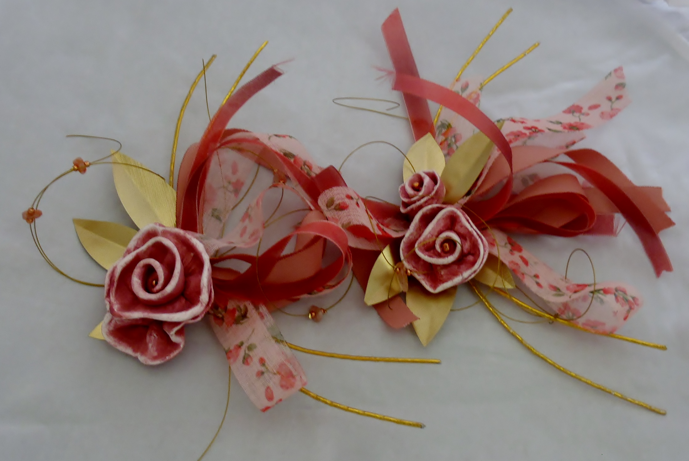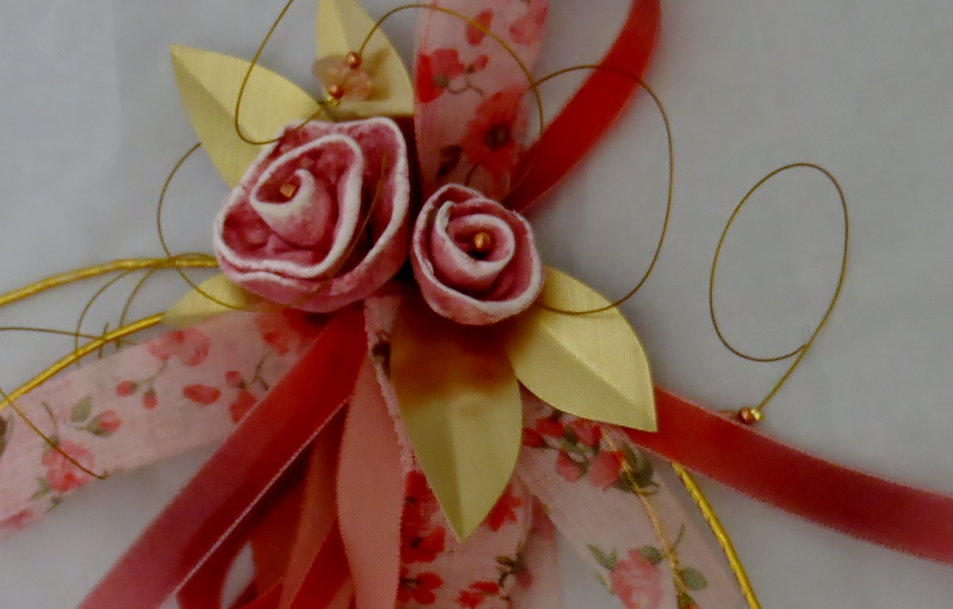 Χειροποίητο μπρούτζινο επιτραπέζιο κλαδί με κεραμικά τριαντάφυλλα σε δύο σχέδια διακοσμημένο με κορδέλες σε διάσταση 21χ8εκ. ελληνικής κατασκευής.
