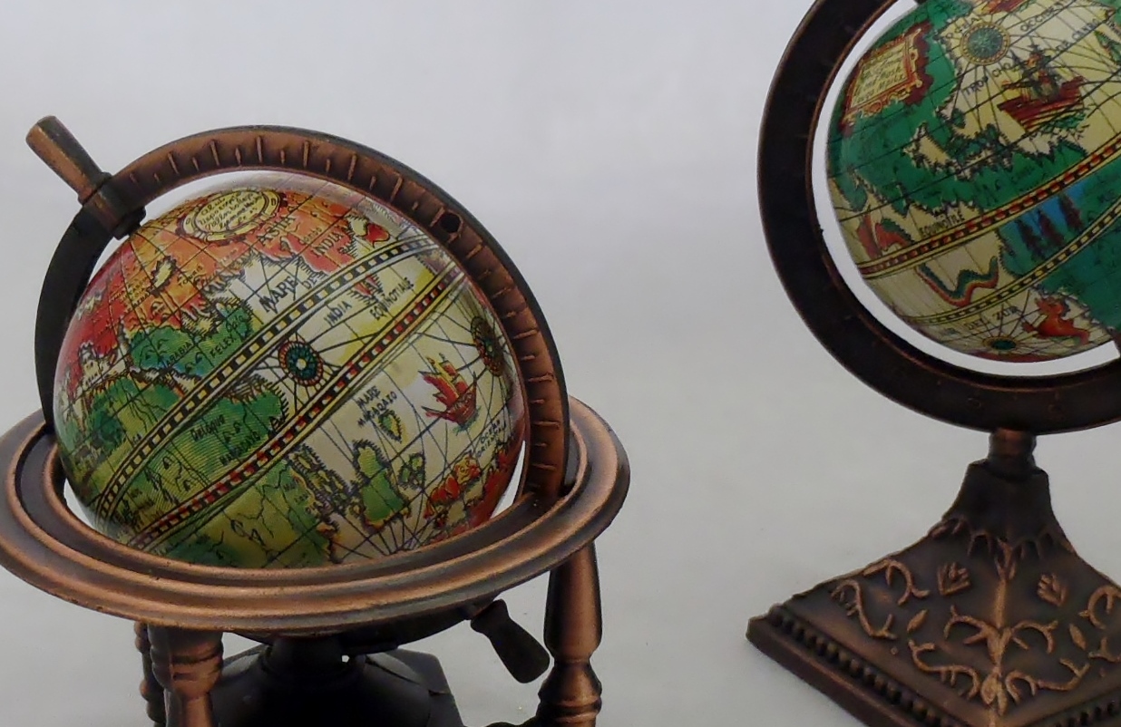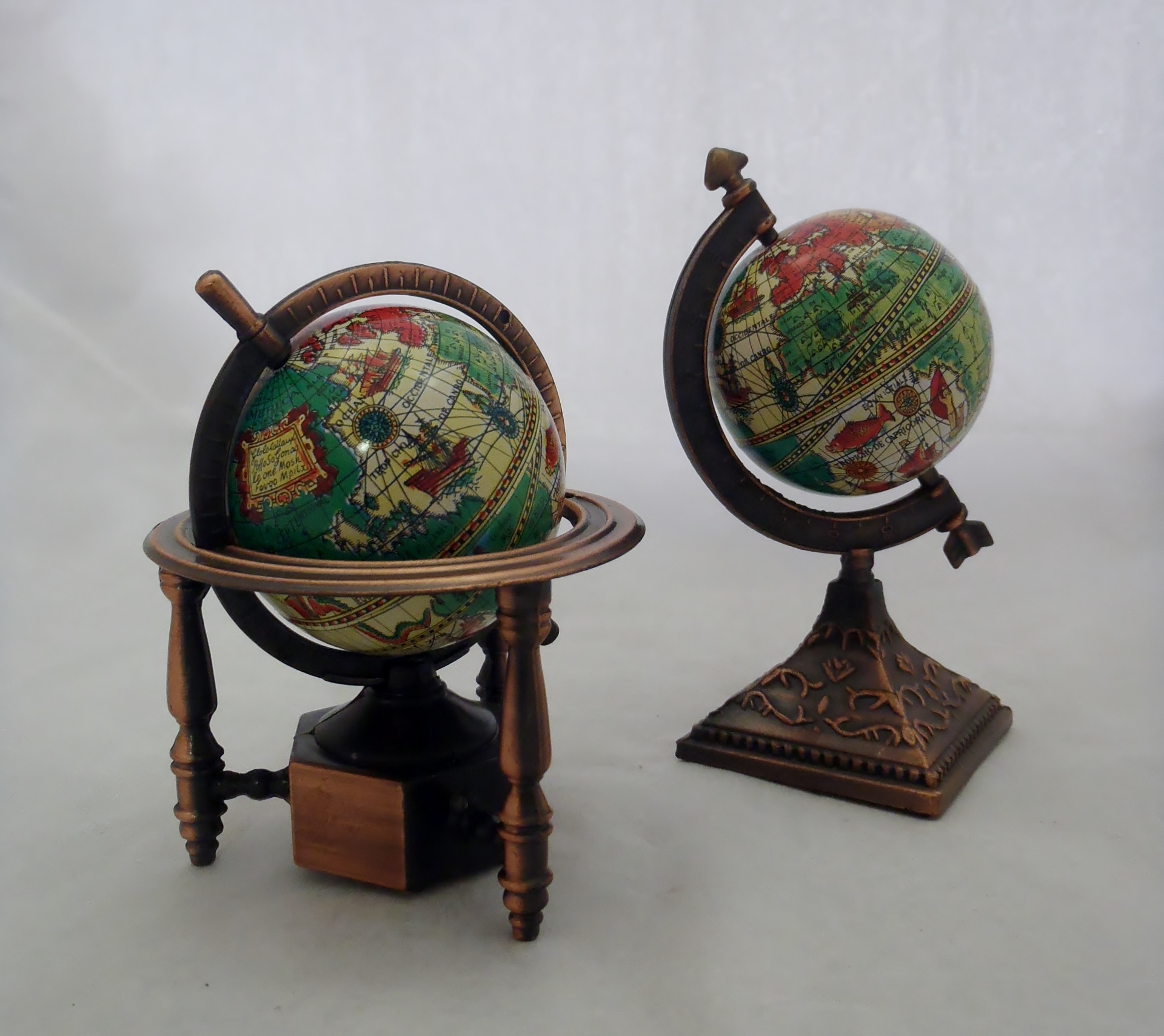 Μεταλλικές επιτραπέζιες μινιατούρες ξύστρες σε μπρονζέ χρώμα σε δύο  σχέδια υδρόγειος σφαίρα και διαστάσεις 7χ6εκ. - 9χ4εκ.