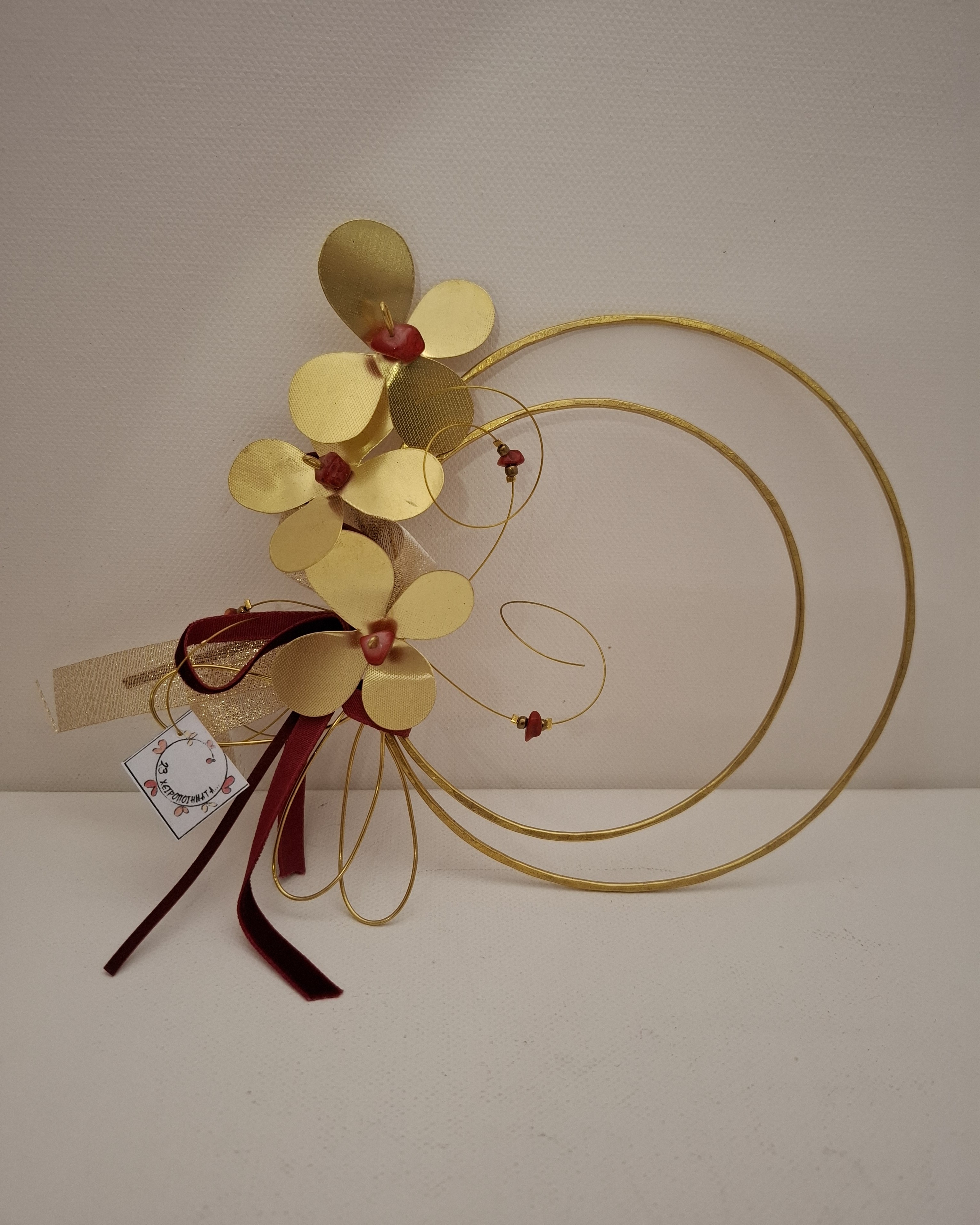 Χειροποίητο στεφάνι τοίχου διακοσμημένο με μπρούτζινα λουλούδια και σε διάσταση 12χ12εκ.