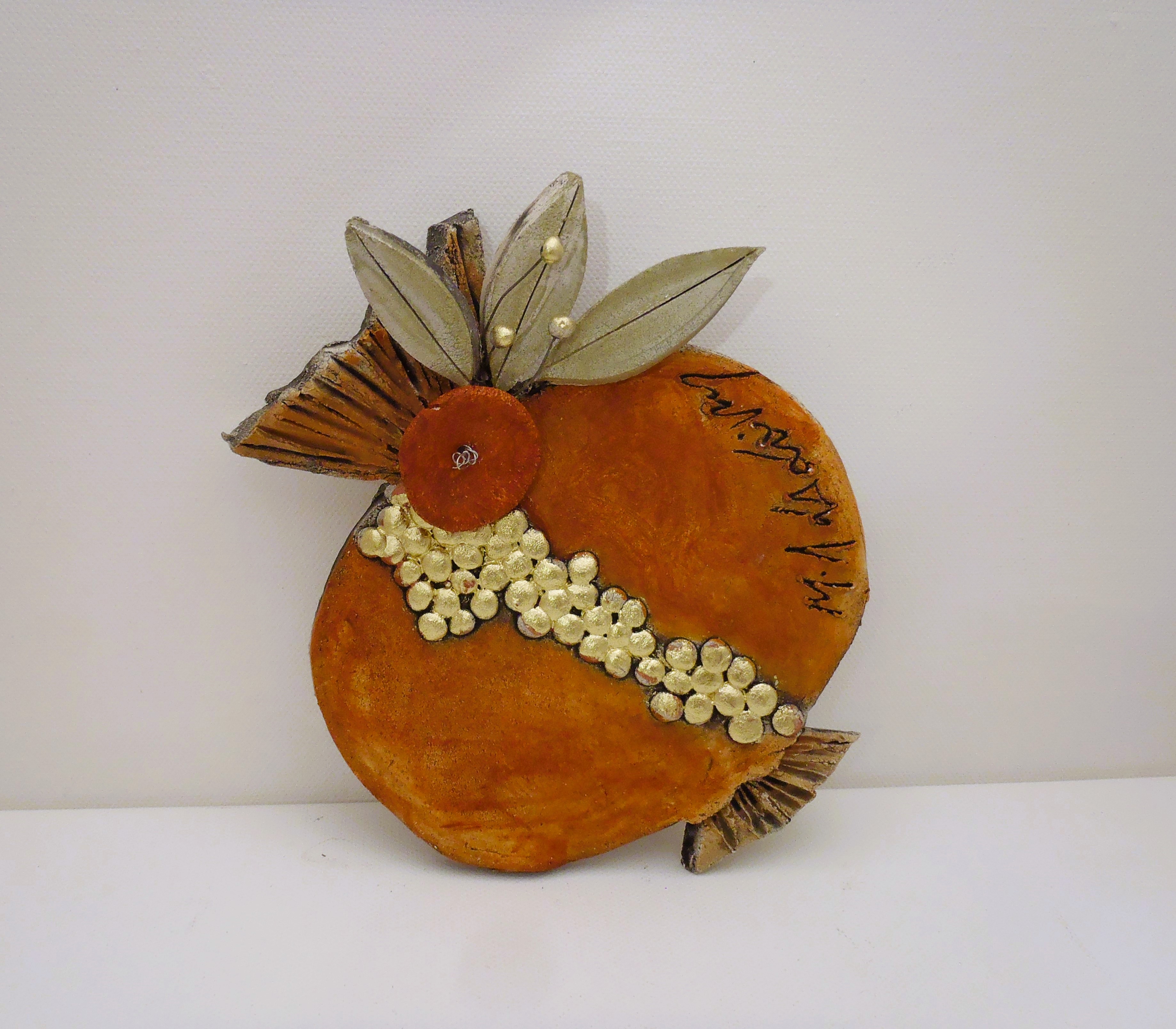 Χειροποίητο επιτοίχιο κεραμικό ρόδι σε διάσταση 14χ17εκ. εμπνευσμένο και κατασκευασμένο από την κεραμίστρια Λαλαούνη Μαρία σε διάφορα σχέδια. Μπορεί να γίνει επιτραπέζιο εάν τοποθετηθεί σε μπρούτζινο καβαλέτο.