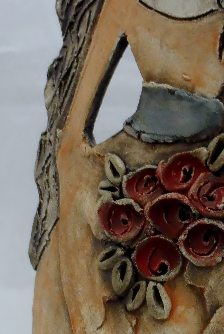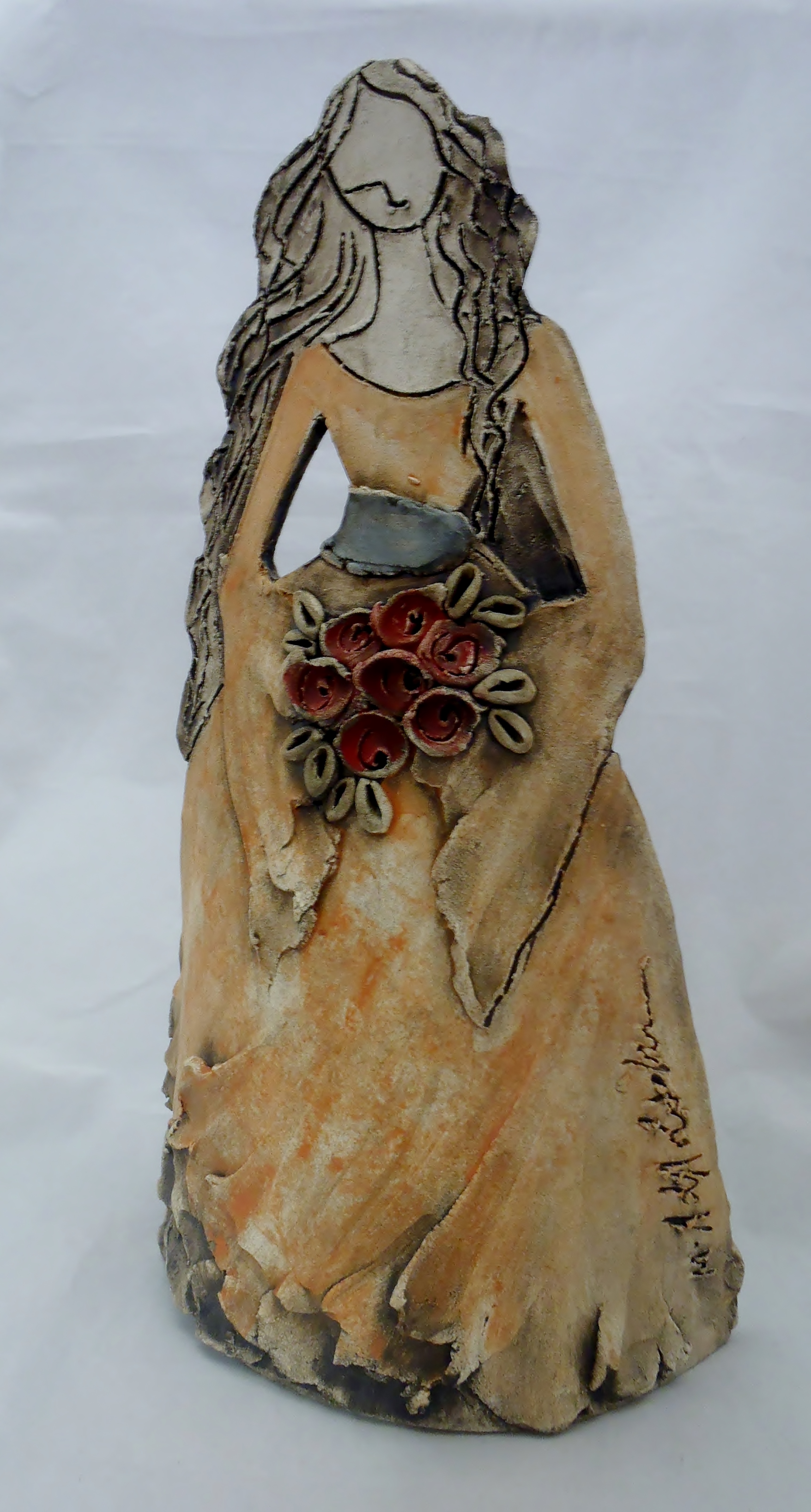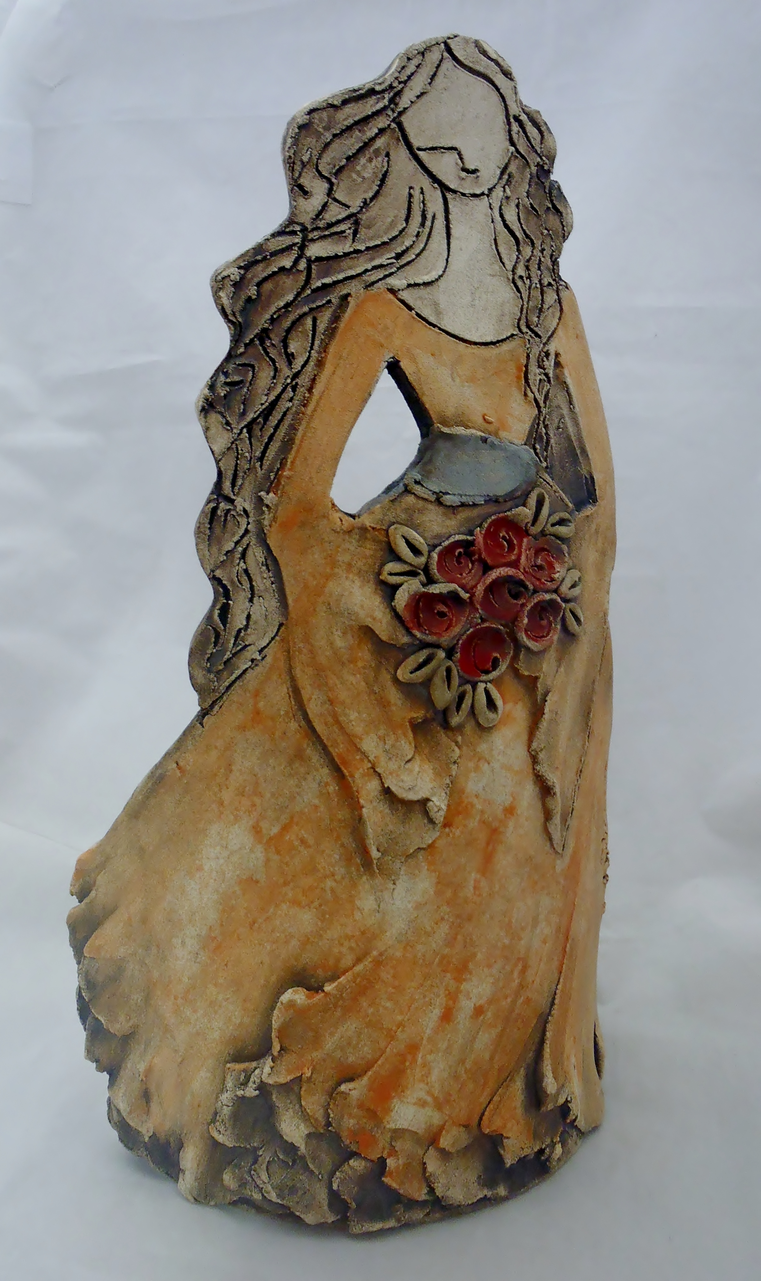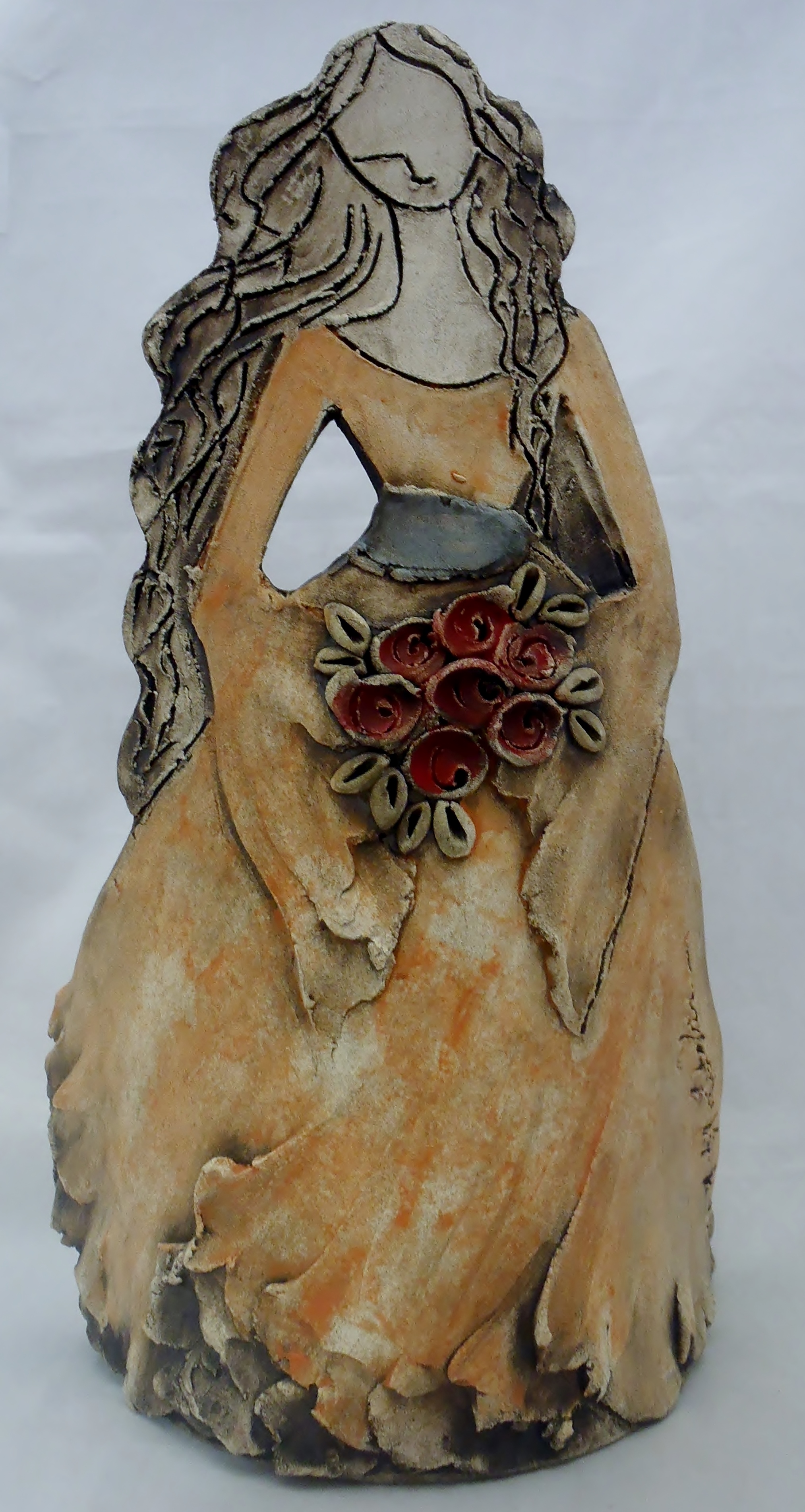 Χειροποίητη κεραμική επιτραπέζια γυναικεία φιγούρα σε πορτοκαλί αποχρώσεις με μπουκέτο λουλούδια