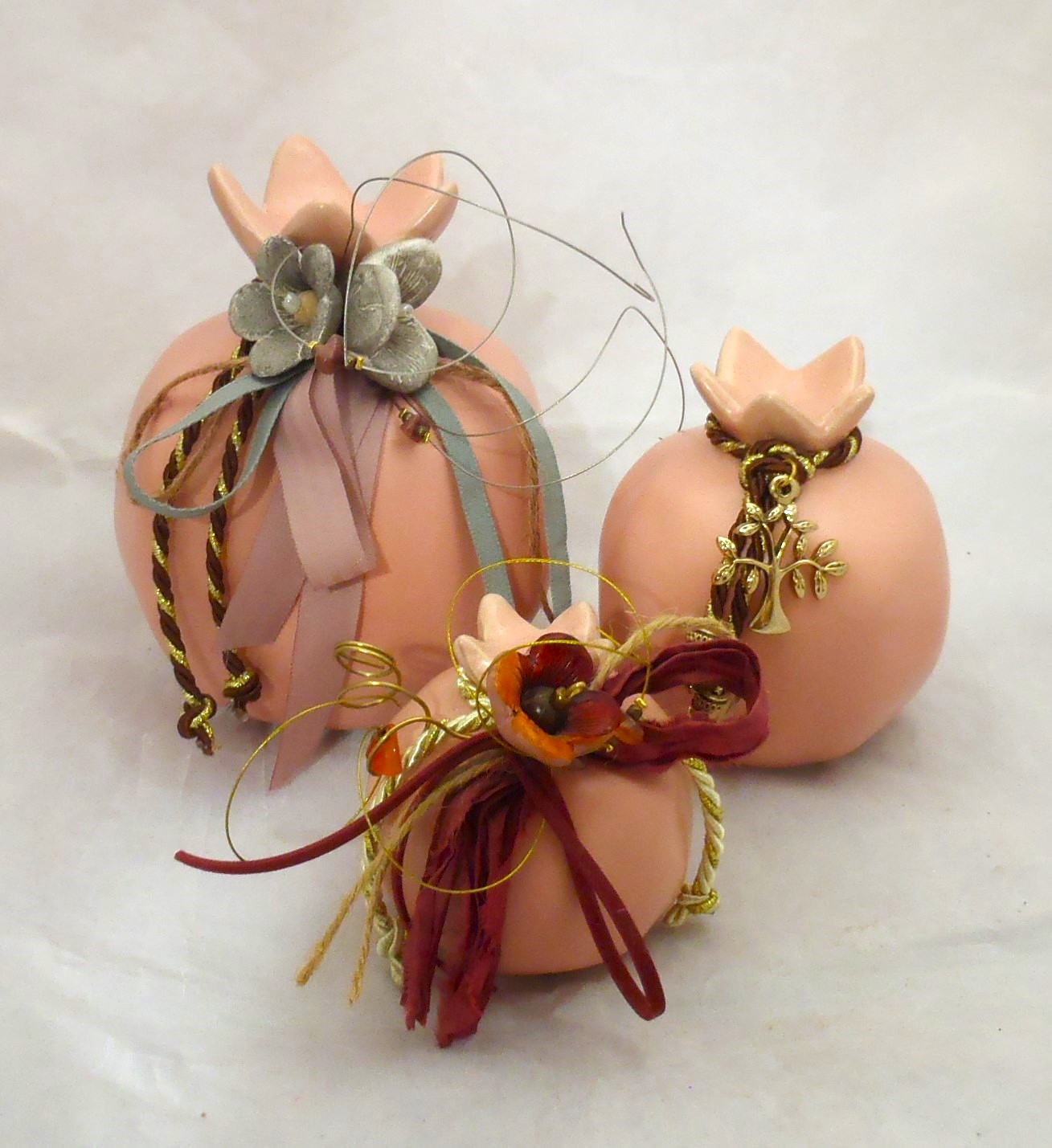 Χειροποίητο κεραμικό ρόδι  σε ροζ χρώμα  διακοσμημένο με  κεραμικά ή μπρούτζινα στοιχεία