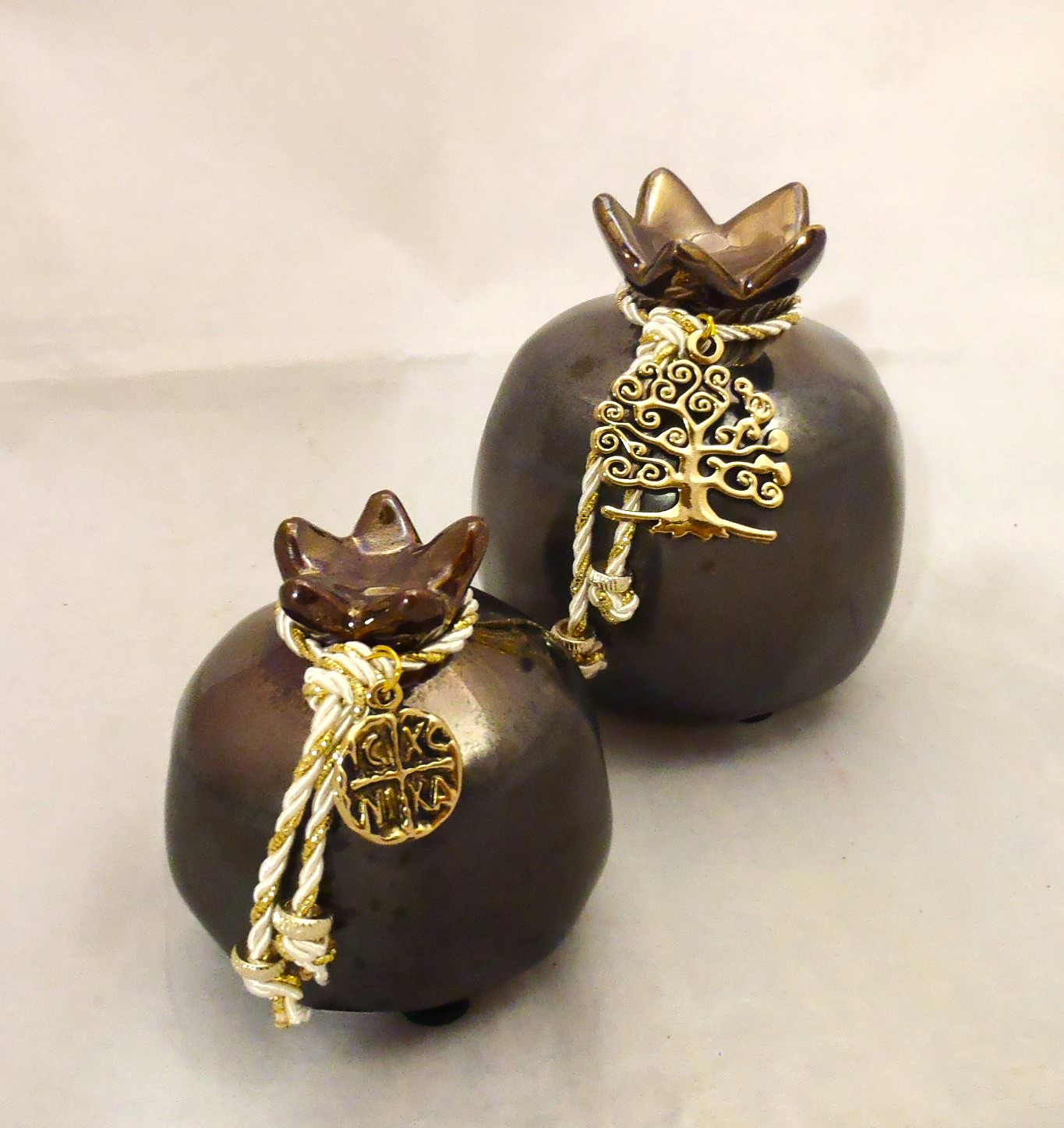 Χειροποίητο ρόδι από πηλό σε μπρονζέ χρώμα και διακόσμηση. Διαθέσιμο σε δύο μεγέθη.