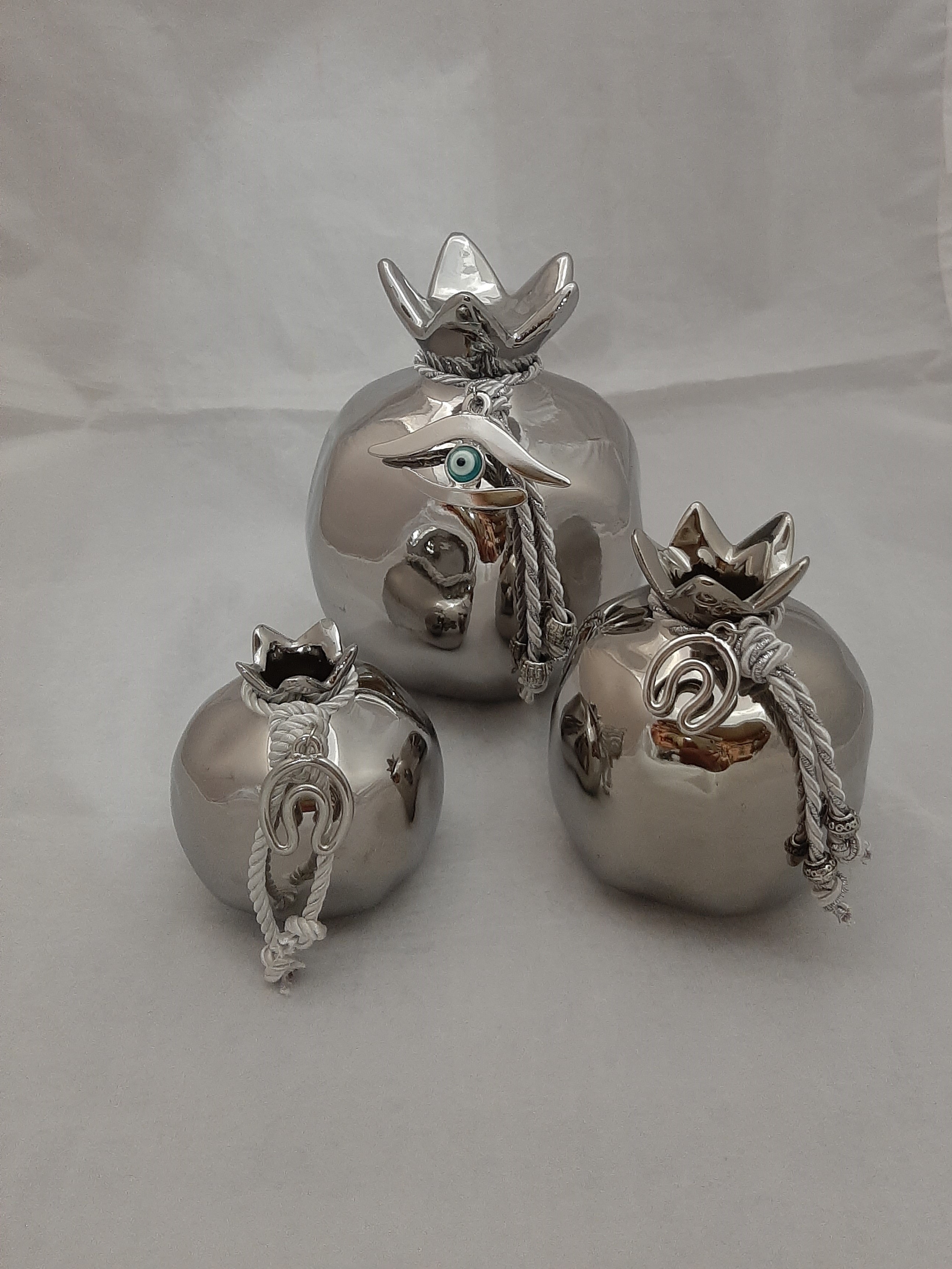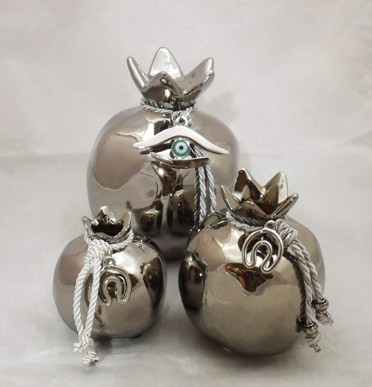 Χειροποίητα ρόδια από πηλό σε ασημί χρώμα με διακόσμηση.