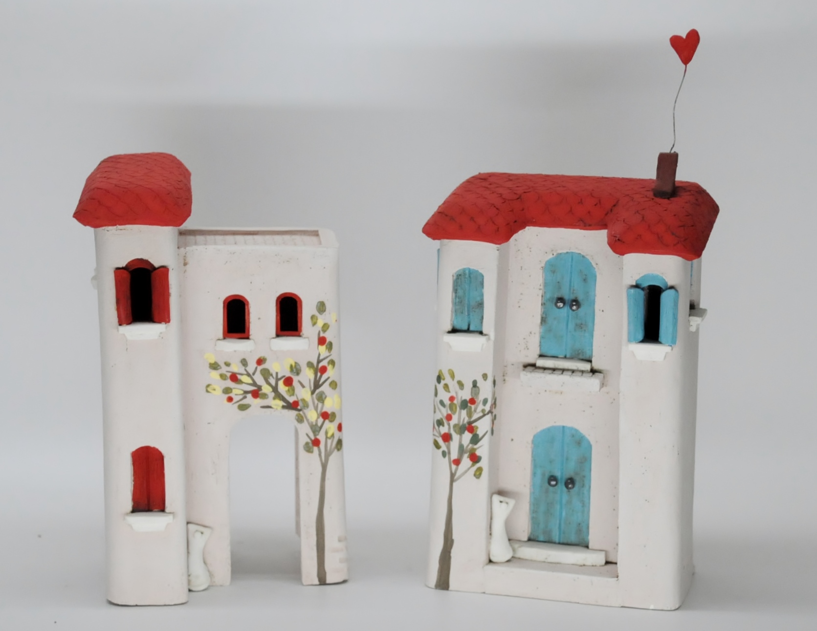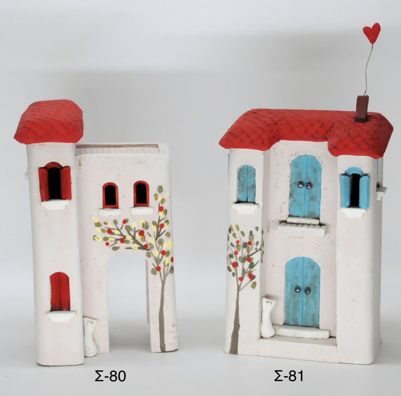 Χειροποίητα επιτραπέζια κεραμικά σπίτια ελληνικής κατασκευής με θέση για κεράκι ρεσώ στο εσωτερικό τους  σε δύο σχέδια με διάσταση ύψους 21εκ. και βάρος 1,400γρ