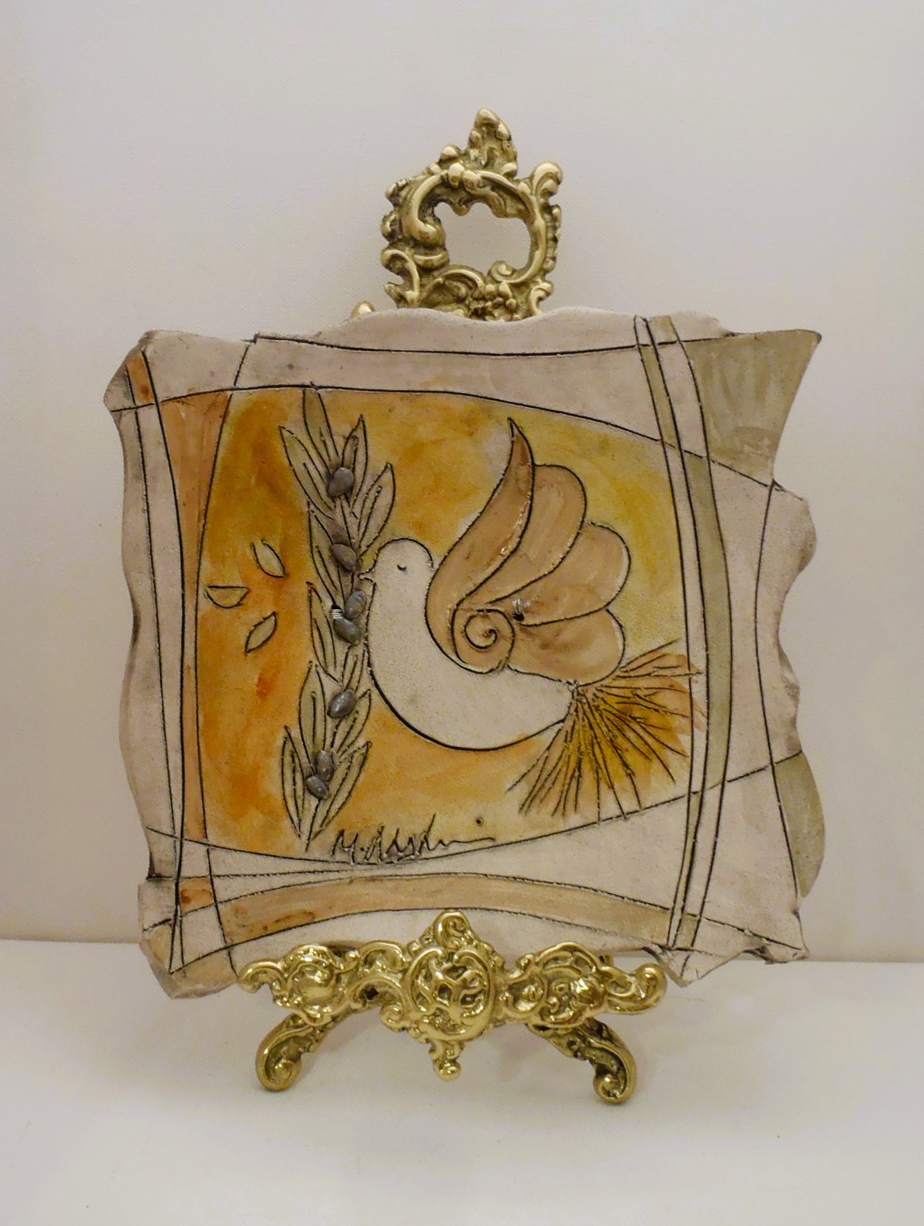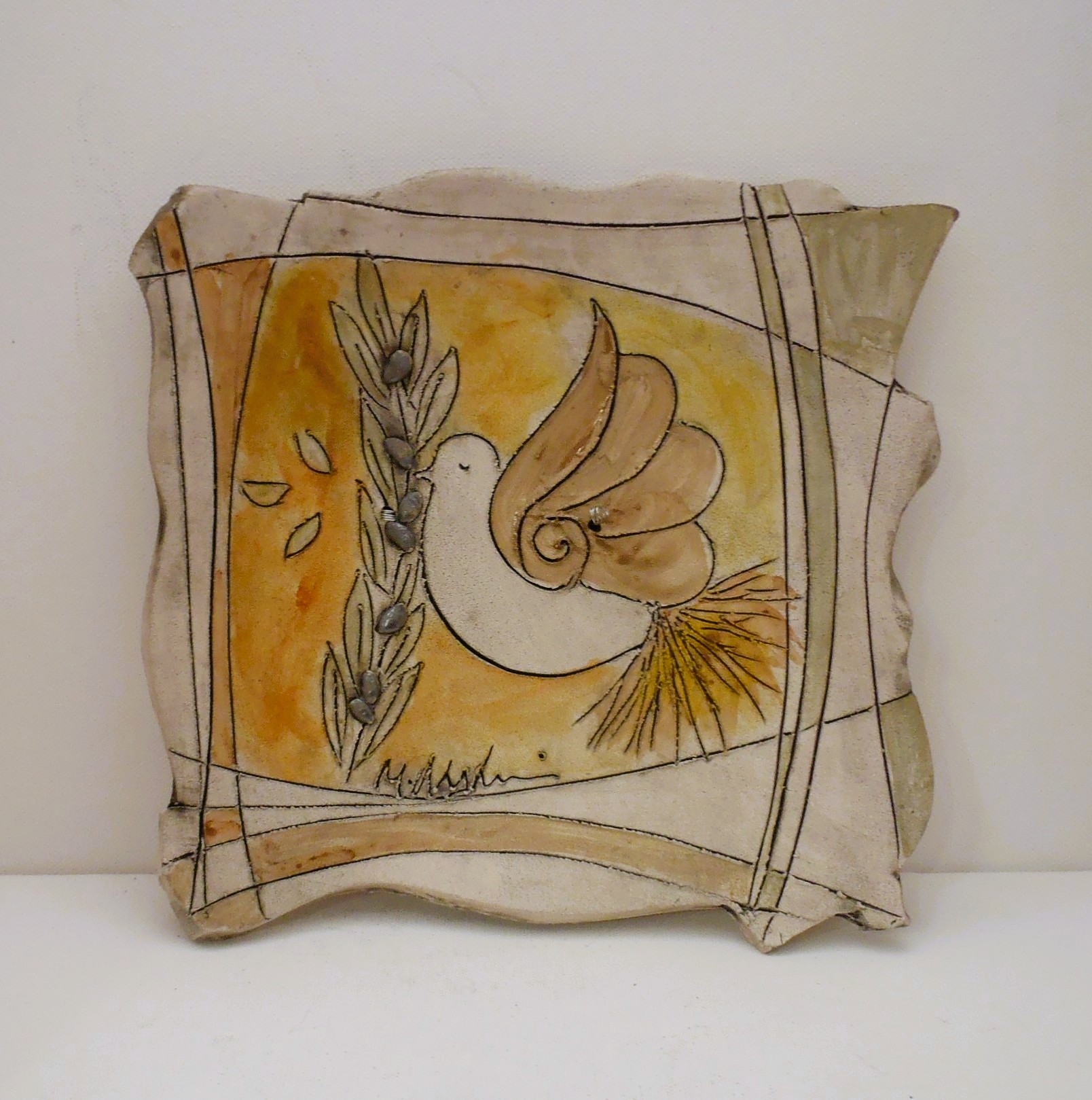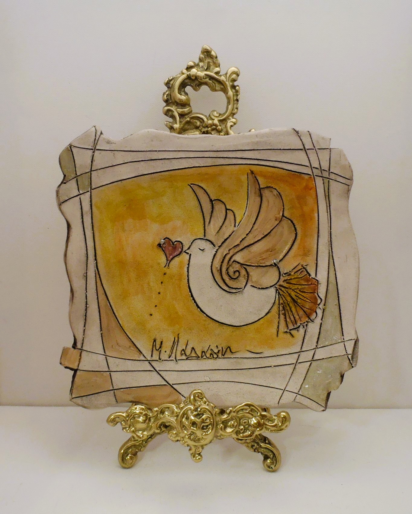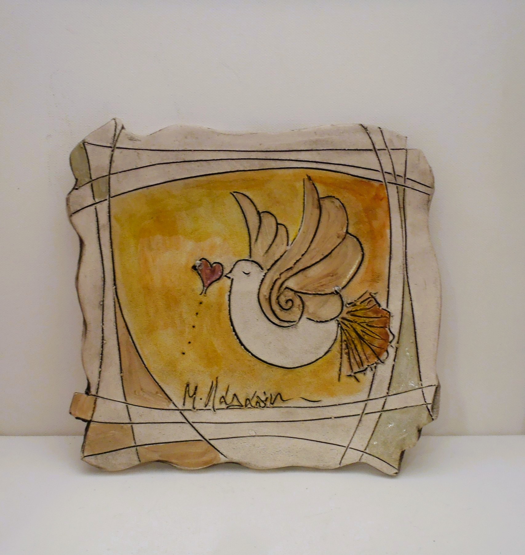 Χειροποίητη Κεραμική πιατέλα επιτραπέζια και τοίχου σε δύο σχέδια με περιστεράκια σε διάσταση 22χ22εκ. εμπνευσμένη και κατασκευασμένη από την κεραμίστρια Λαλαούνη Μαρία . Η μπρούτζινη βάση της φωτογραφίας δεν περιλαμβάνετε στην τιμή.