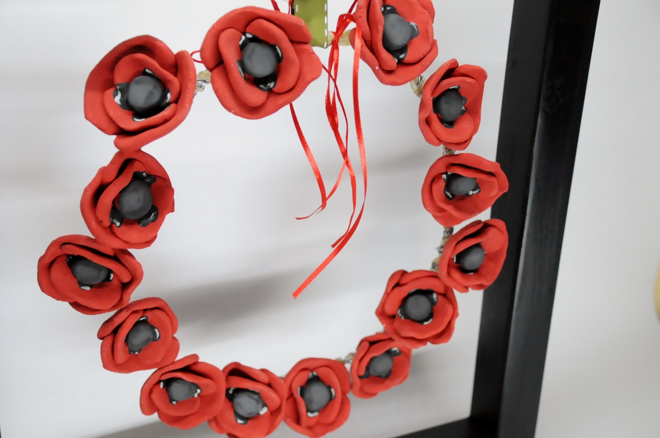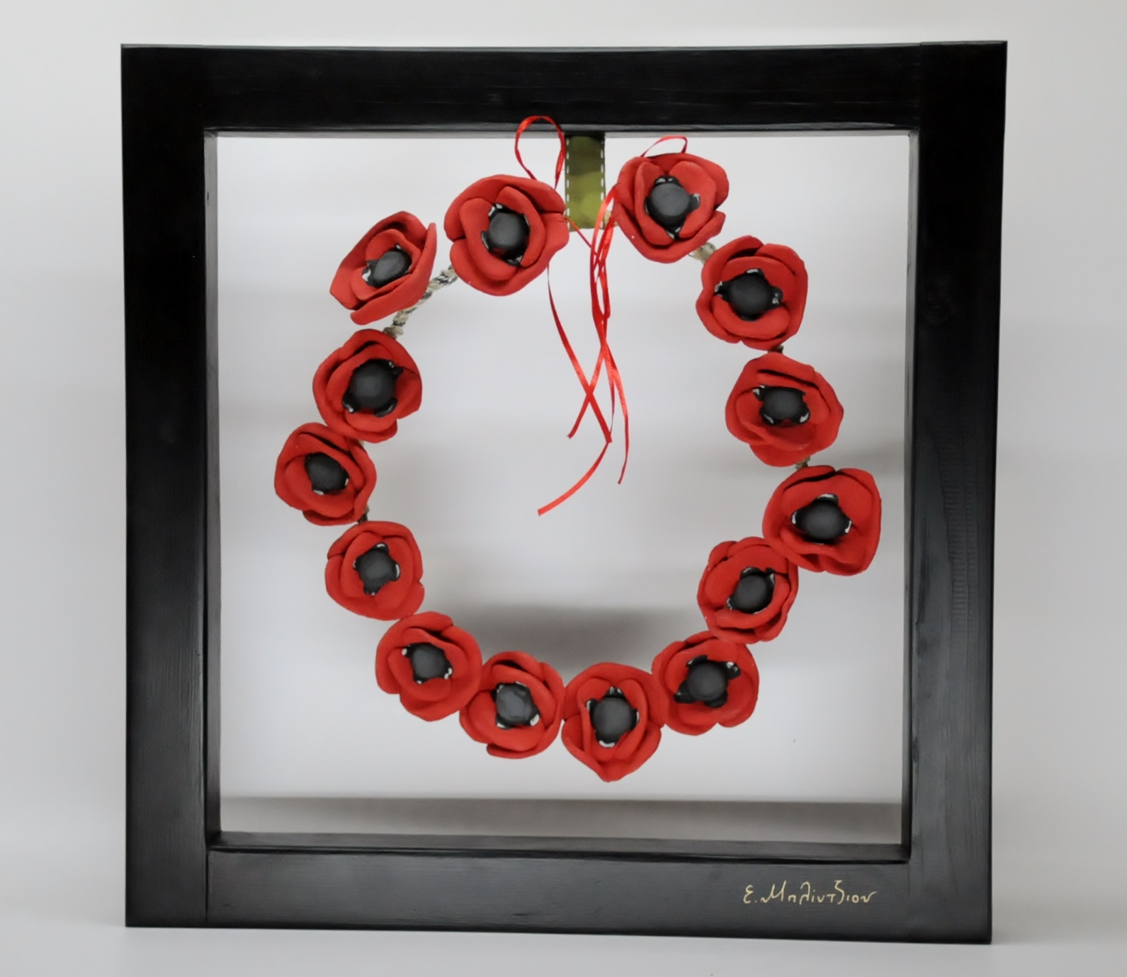 Χειροποίητο καδράκι που αποτελείται από στεφάνι με κεραμικά λουλούδια τοποθετημένο σε ξύλινο πλαίσιο ελληνικής κατασκευής και σε διάσταση 45χ45εκ. και βάρος 2,200γρ