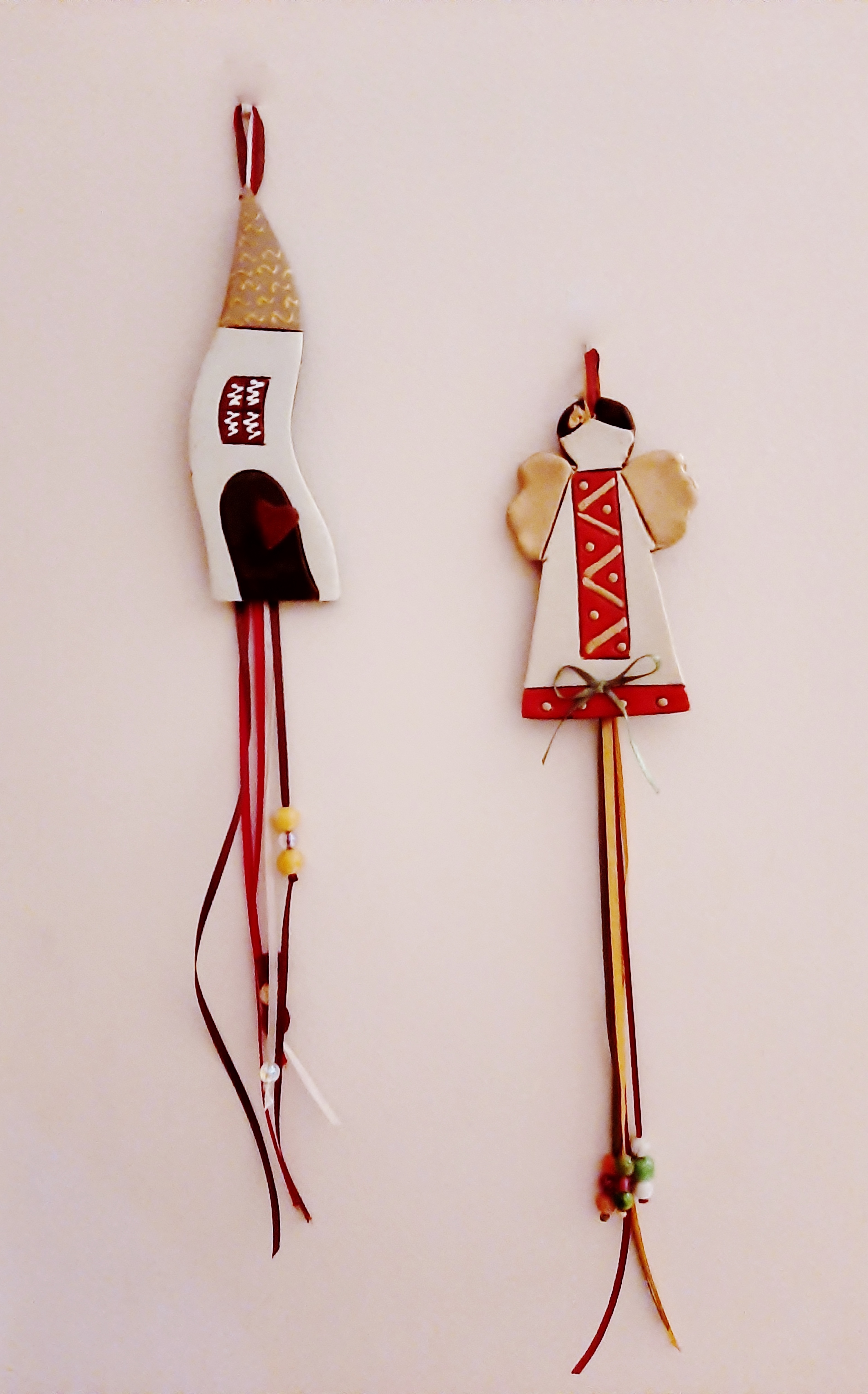 Χειροποίητο κεραμικό γούρι τοίχου σε δύο σχέδια σπιτάκι σε διάσταση 15χ5εκ.και άγγελος σε διάσταση12χ6 εκ διαστάσεις στοιχείου διακοσμημένο με κορδέλες και χάντρες , μαζί με τις κορδέλες η διάσταση τους είναι περίπου 40 εκ.