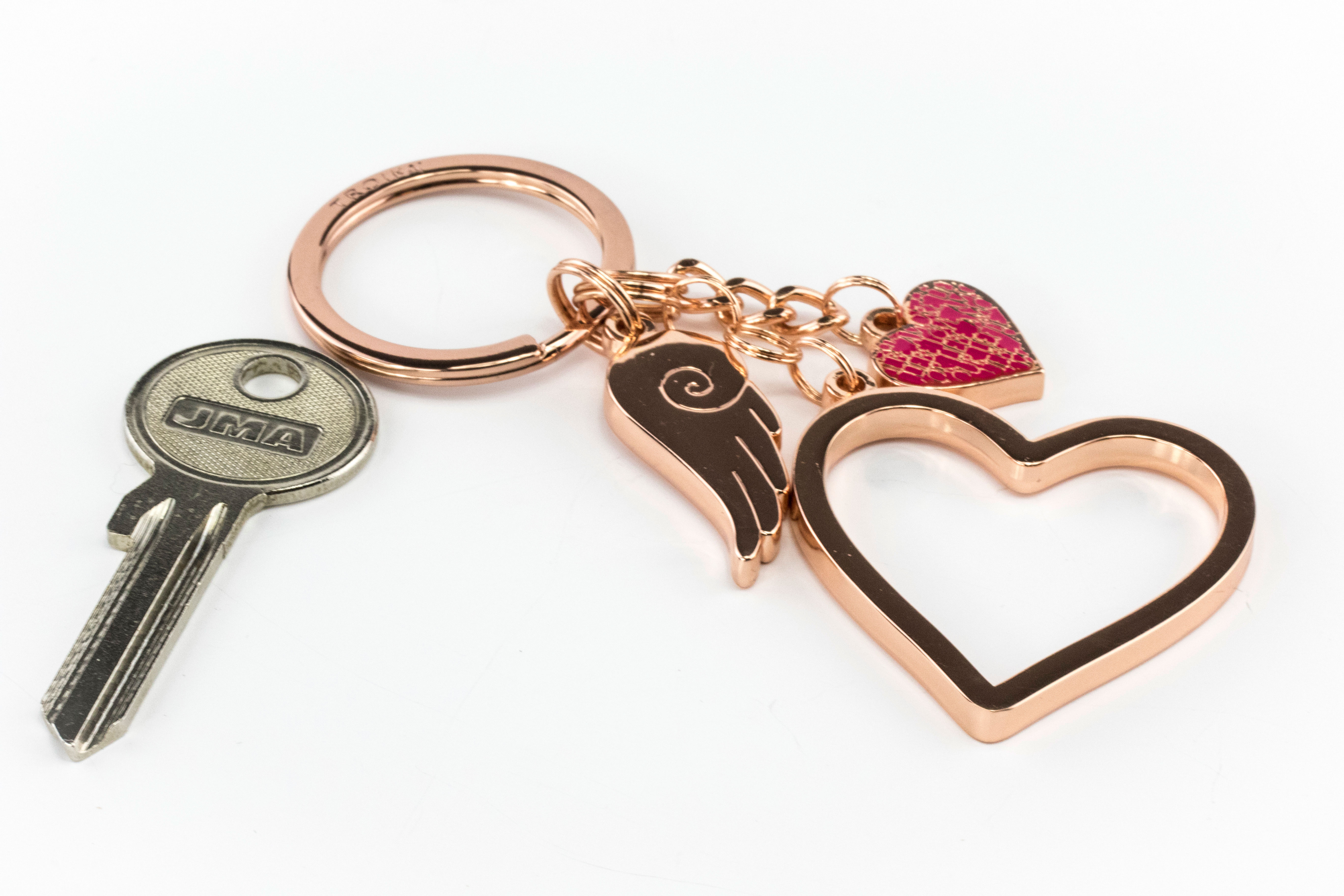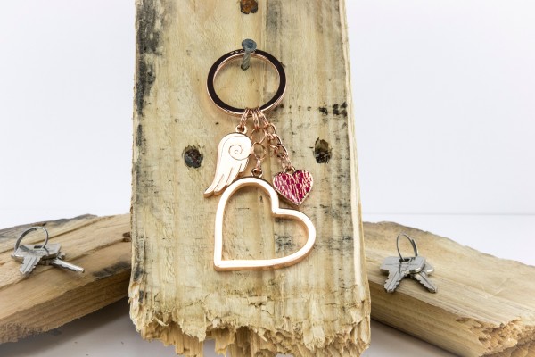 Μπρελόκ κατασκευασμένο από χυτό σίδηρο σε χρώμα χρυσό-ροζ διακοσμημένο με σμάλτο σε διάσταση 10εκ. με σχέδιο καρδιά μεγάλη, καρδιά μικρή και φτερό αγγέλου.