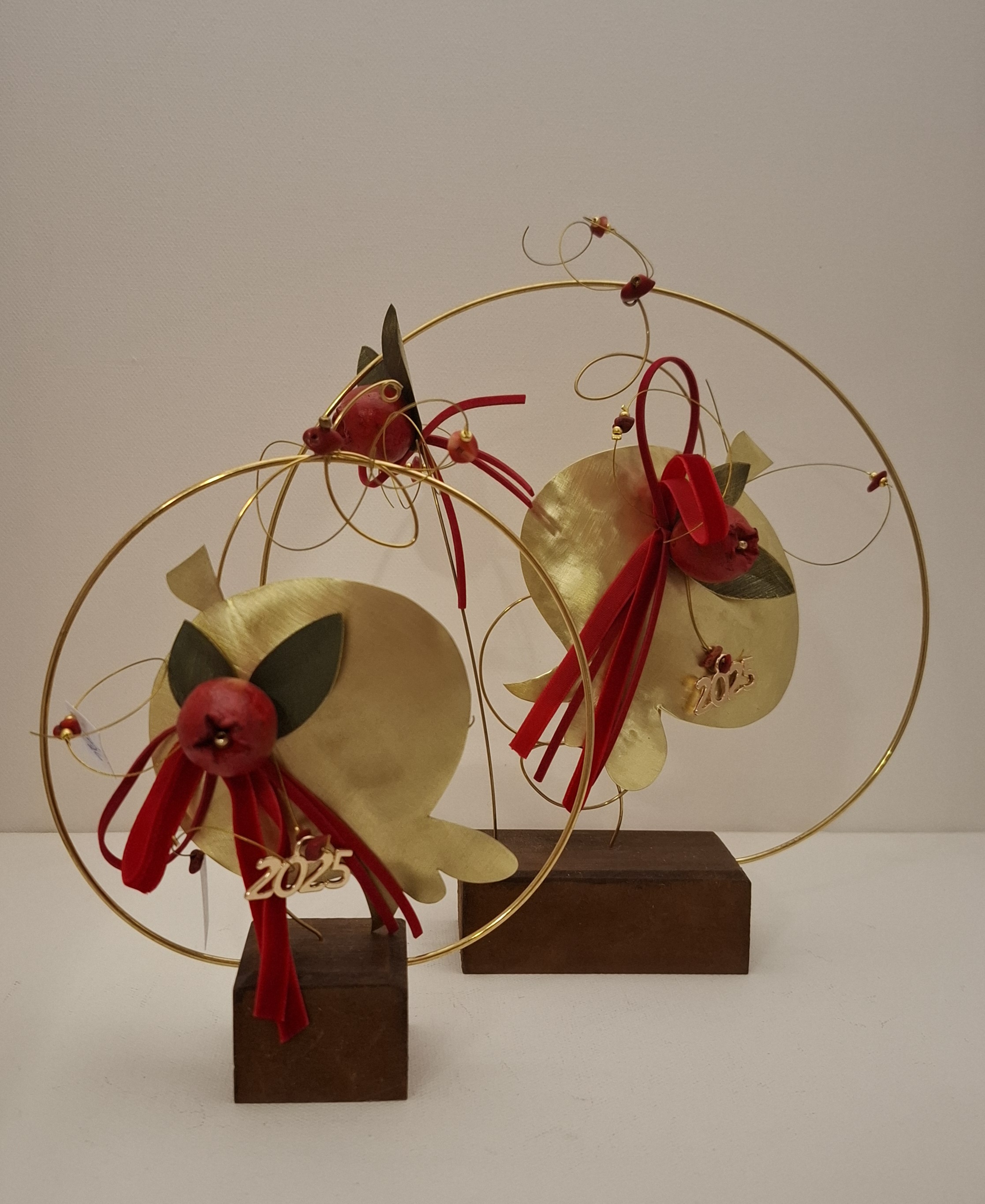 Χειροποίητο επιτραπέζιο γούρι στεφάνι ροδιάς κατασκευασμένο από μπρούτζο με ρόδια κεραμικά τοποθετημένο σε ξύλινη βάση σε διάσταση 16χ13εκ. και 20χ20εκ.