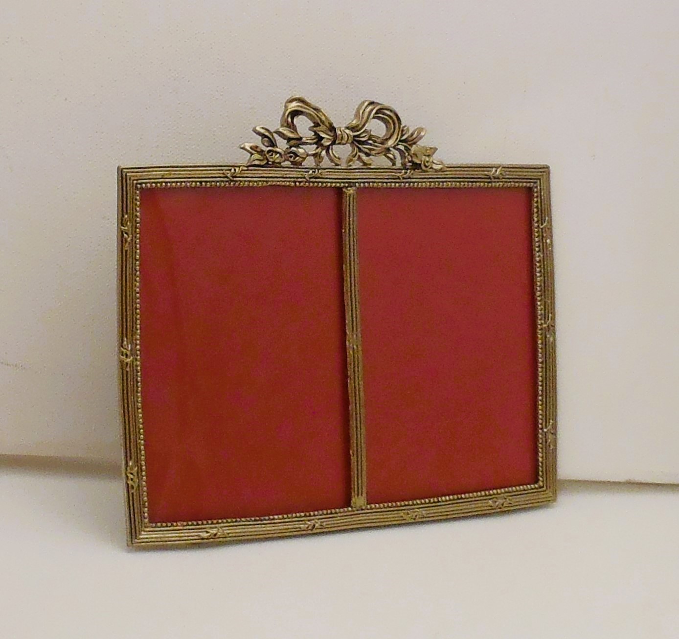 Χειροποίητη χρυσή κορνίζα ελληνικής κατασκευής από κράμα κασσίτερου επενδυμένη με φύλλο χρυσού για δύο φωτογραφίες σε διάσταση 8χ12εκ. η κάθε μία φωτογραφία. Διάσταση κορνίζας16χ18εκ. Διατίθεται και σε ασημένια.