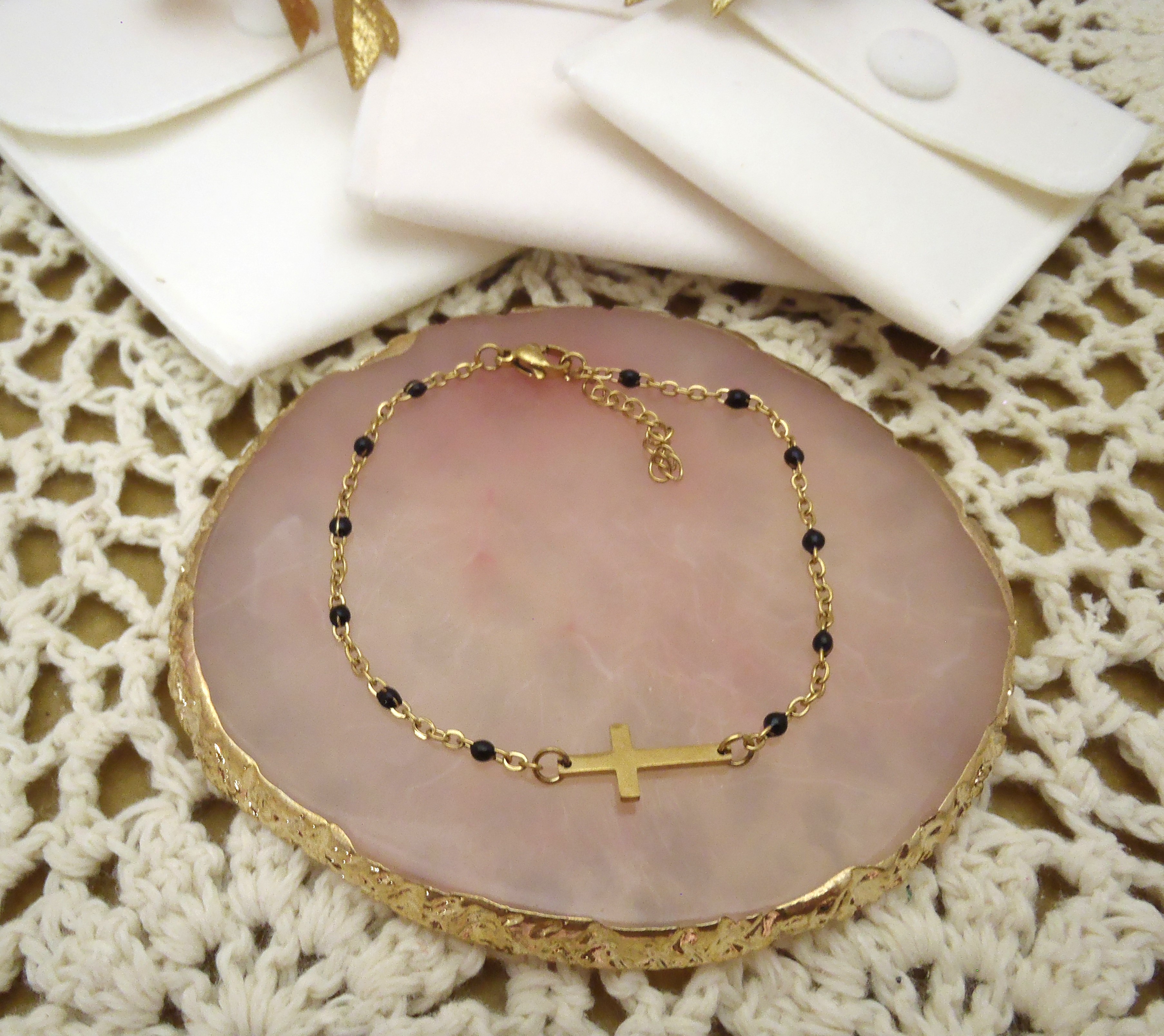 Βραχιόλι με  πέτρες και σταυρουδάκι σε χρυσό χρώμα.