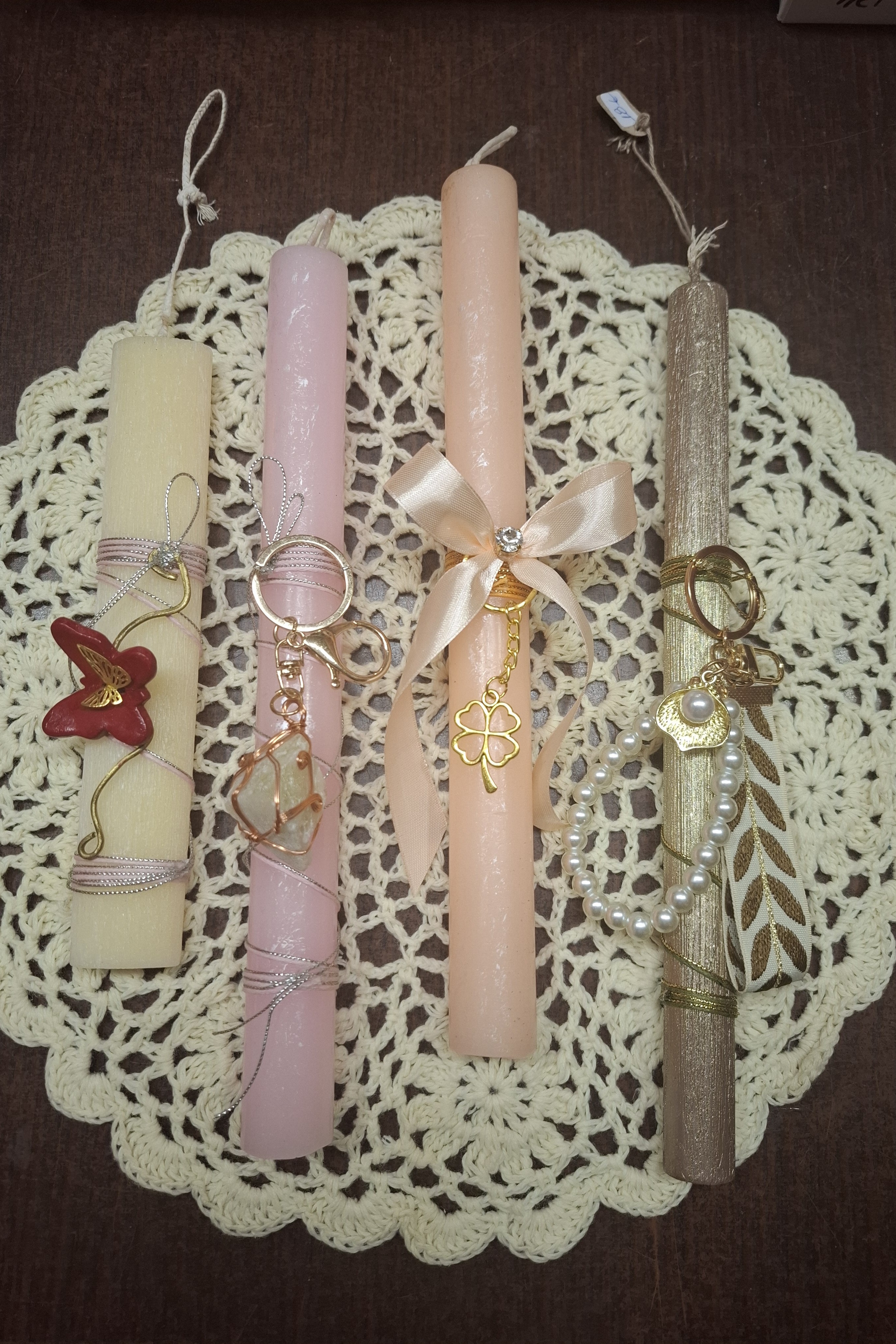 Χειροποίητες λαμπάδες και χειροποίητες αρωματικές λαμπάδες σε διάφορα χρώματα διακοσμημένες με μπρούτζινα και κεραμικά στοιχεία.