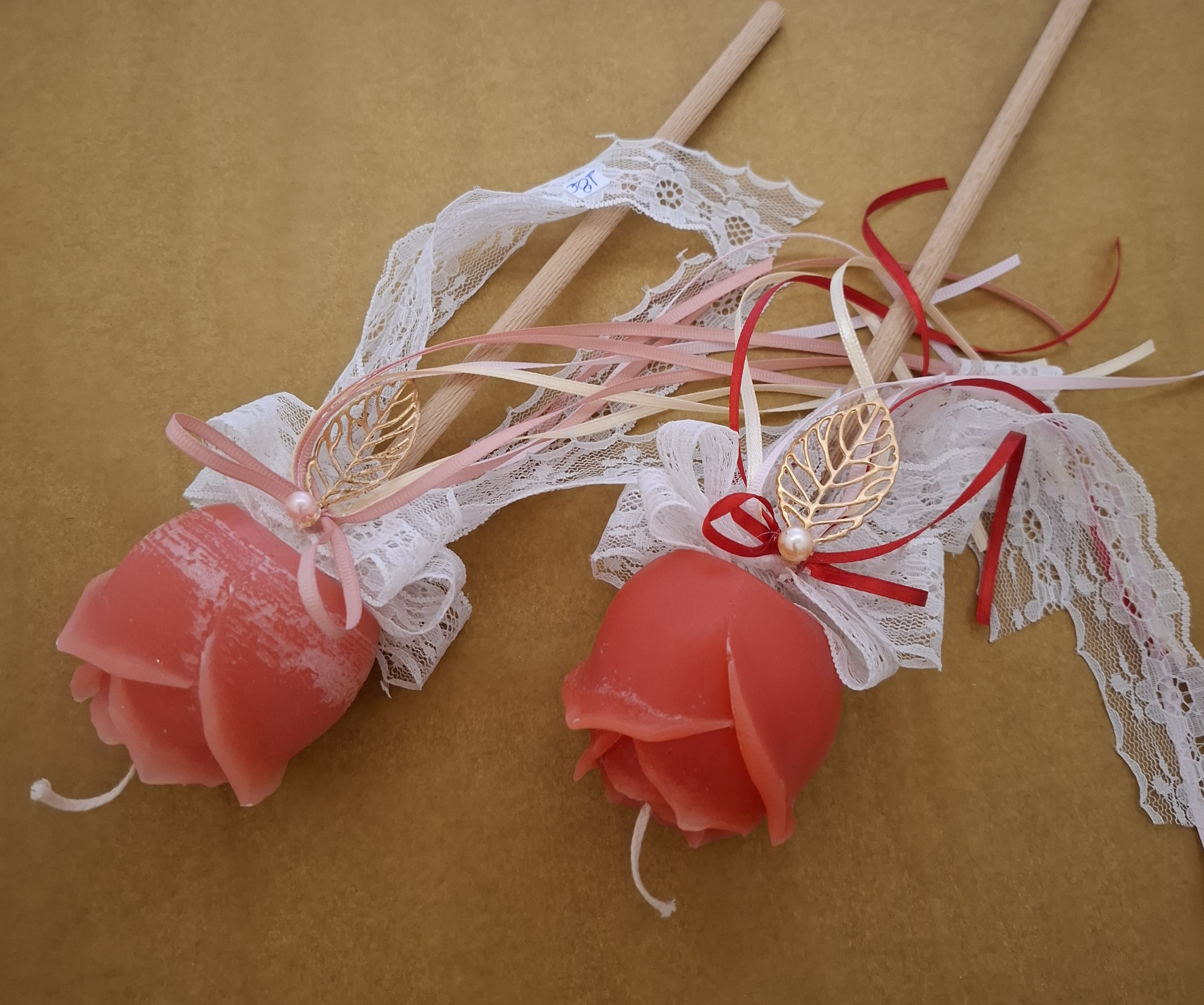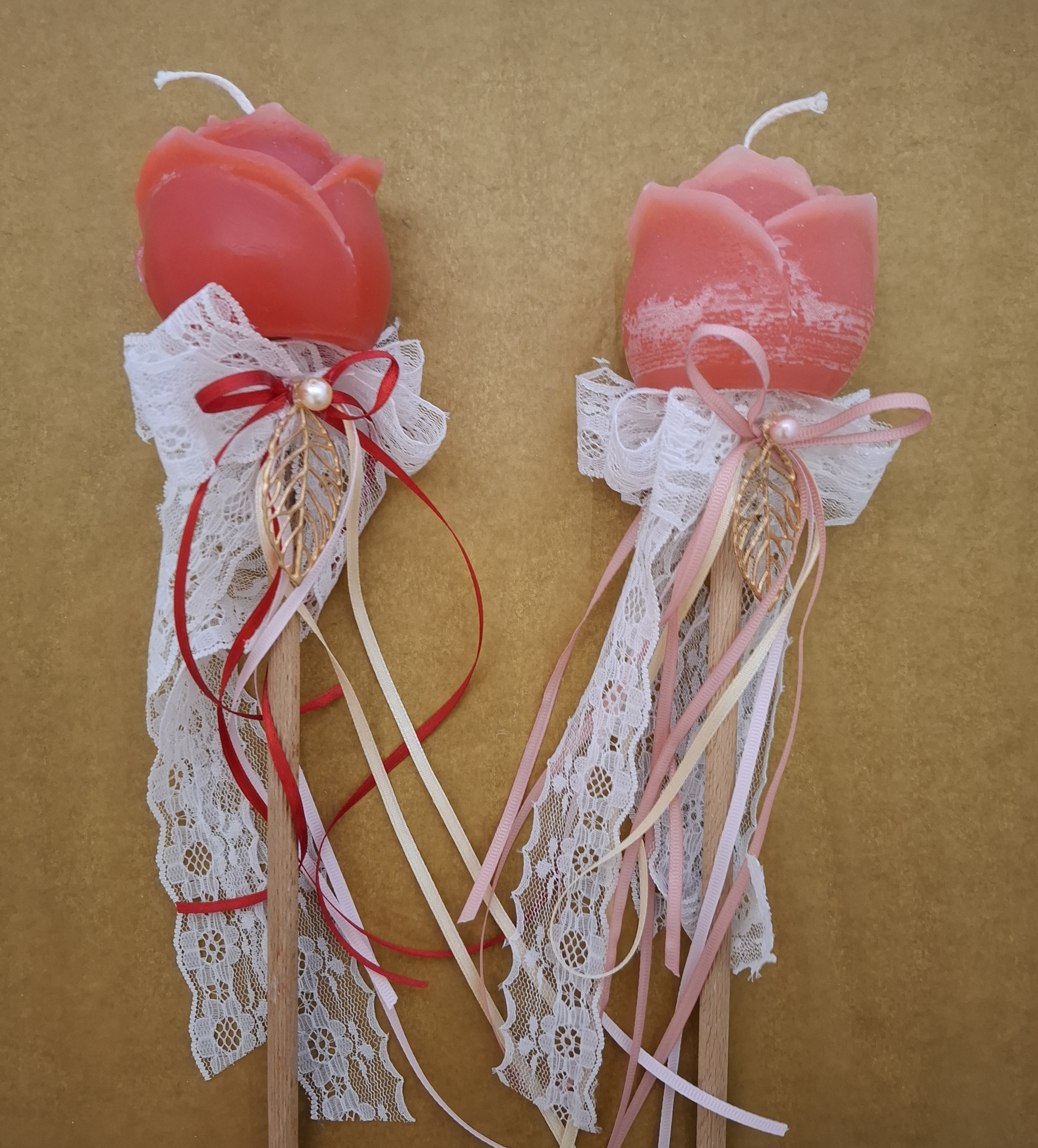 Χειροποίητη αρωματική λάμπα διακοσμημένη με δαντέλα, πέρλες και μπρούτζινα στοιχεία με κέρινα λουλούδια σε διάφορα χρώματα