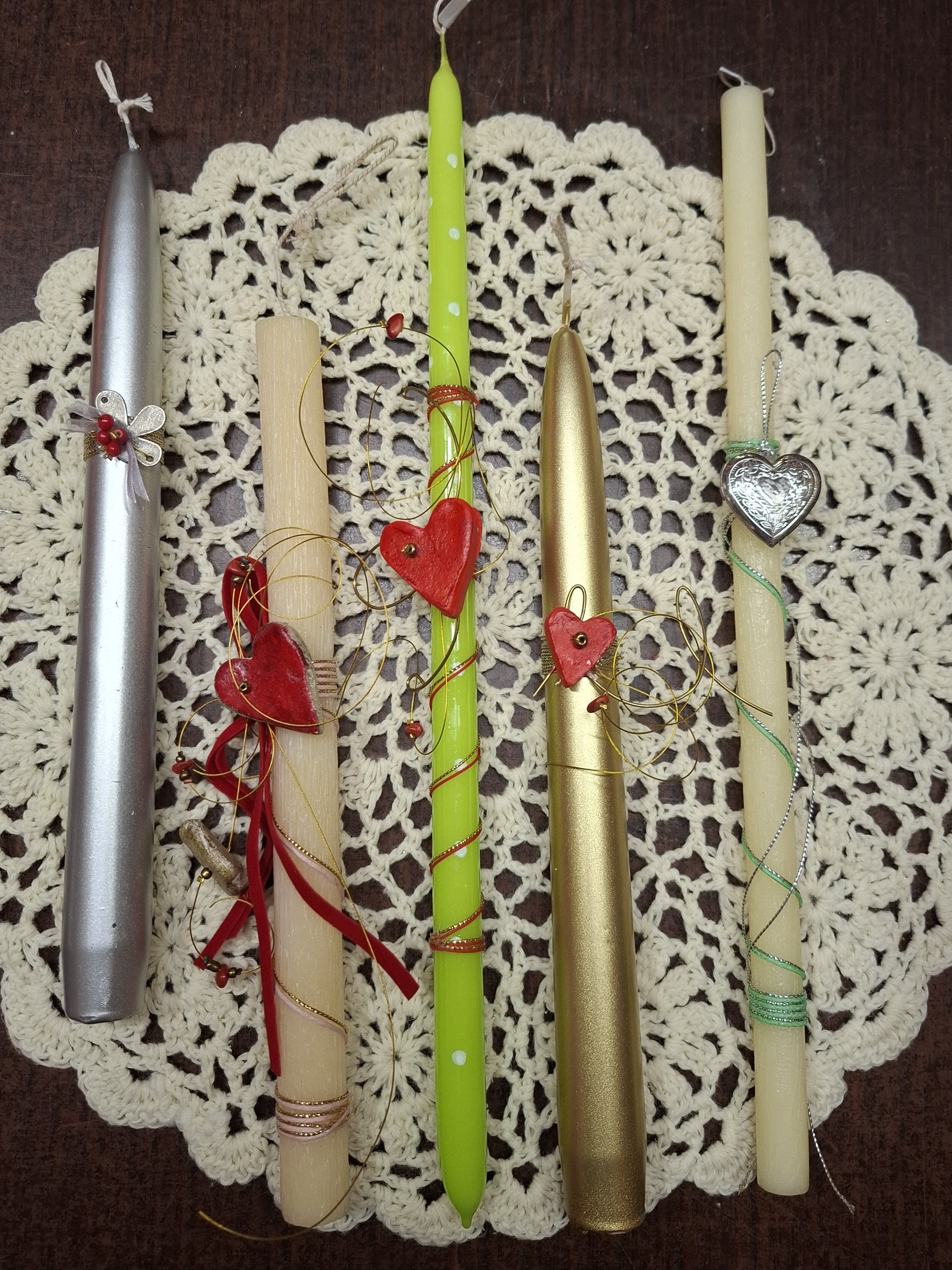 Χειροποίητες λαμπάδες και χειροποίητες αρωματικές λαμπάδες σε διάφορα χρώματα διακοσμημένες με κεραμικά και μεταλλικά χειροποίητα στοιχεία σε σχέδιο καρδιά.