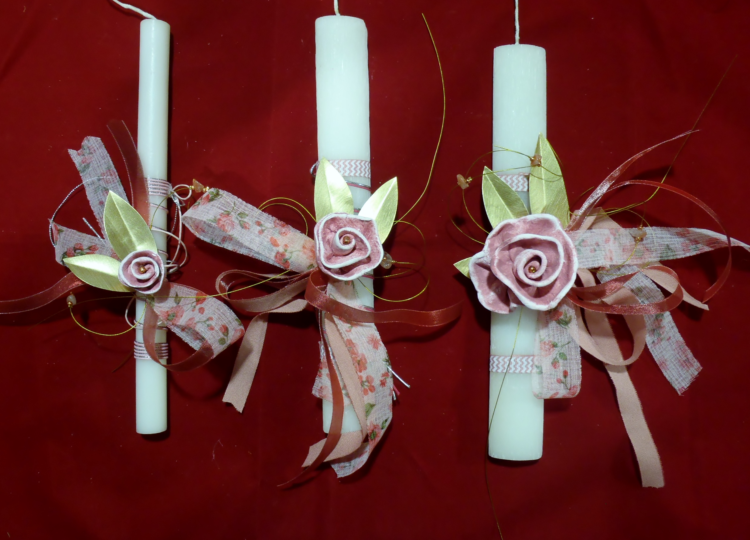 Χειροποίητες λαμπάδες και χειροποίητες αρωματικές λαμπάδες σε διάφορα χρώματα διακοσμημένες με κεραμικά χειροποίητα λουλουδάκια σε τρία μεγέθη και τιμές 16 ευρώ - 20 ευρώ - 24 ευρώ.
