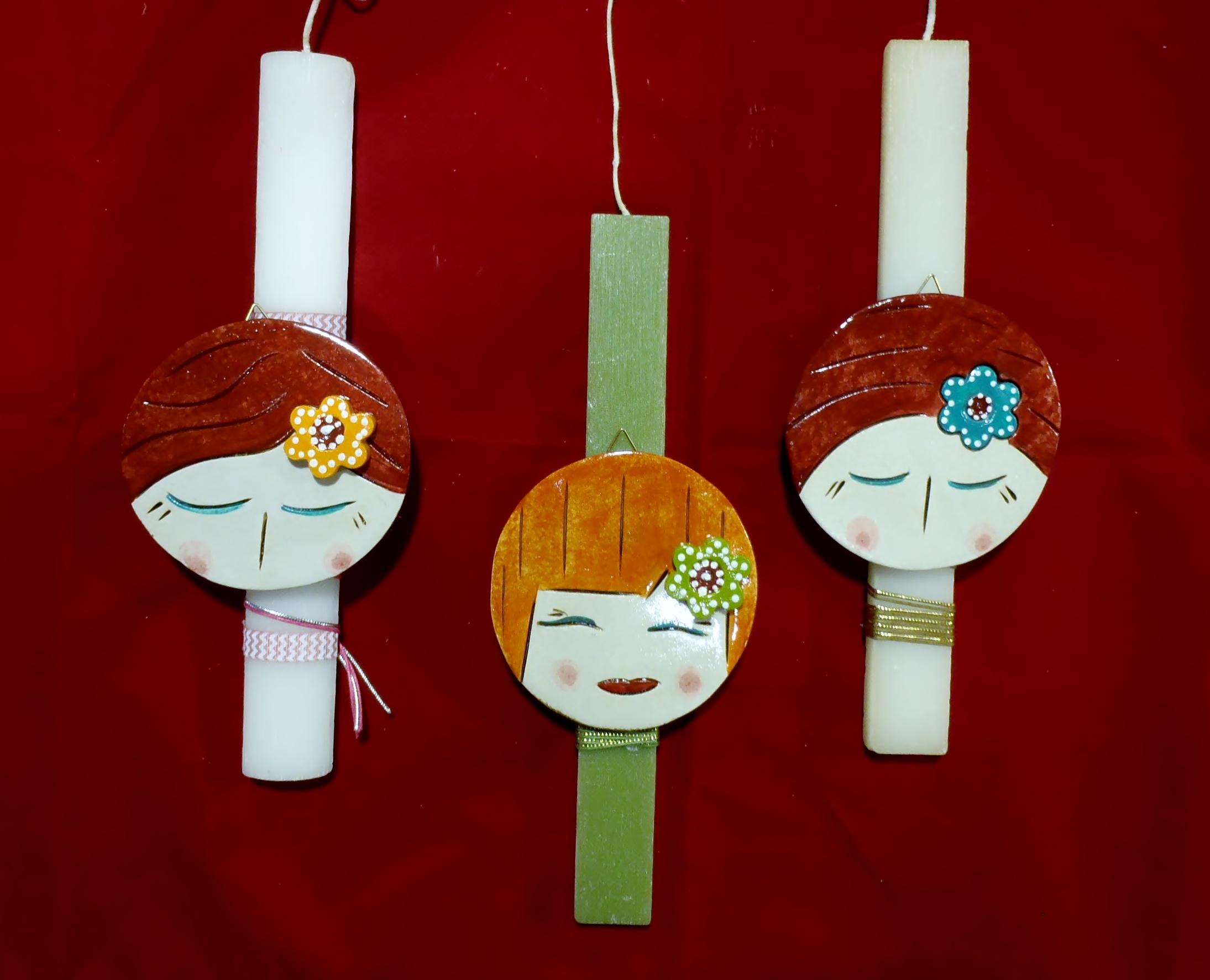 Χειροποίητες λαμπάδες και χειροποίητες αρωματικές λαμπάδες σε διάφορα χρώματα διακοσμημένες με κεραμικά χειροποίητα προσωπάκια