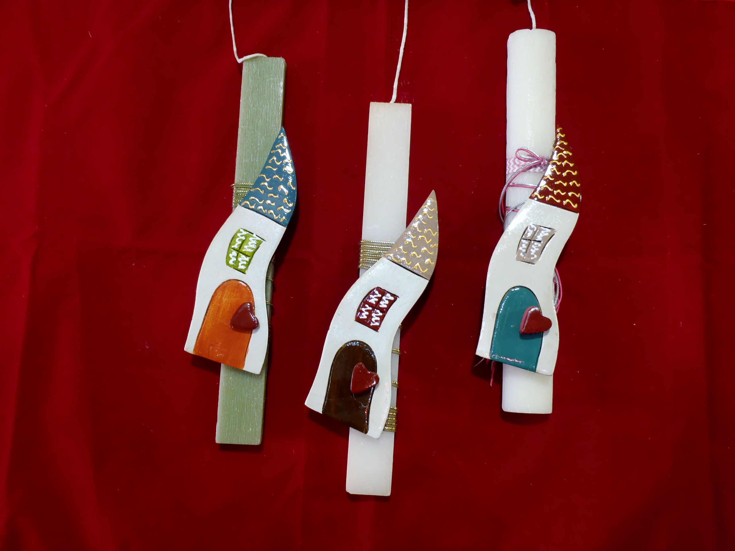 Χειροποίητες λαμπάδες και χειροποίητες αρωματικές λαμπάδες σε διάφορα χρώματα διακοσμημένες με κεραμικά χειροποίητα σπιτάκια σε διάφορα χρώματα.